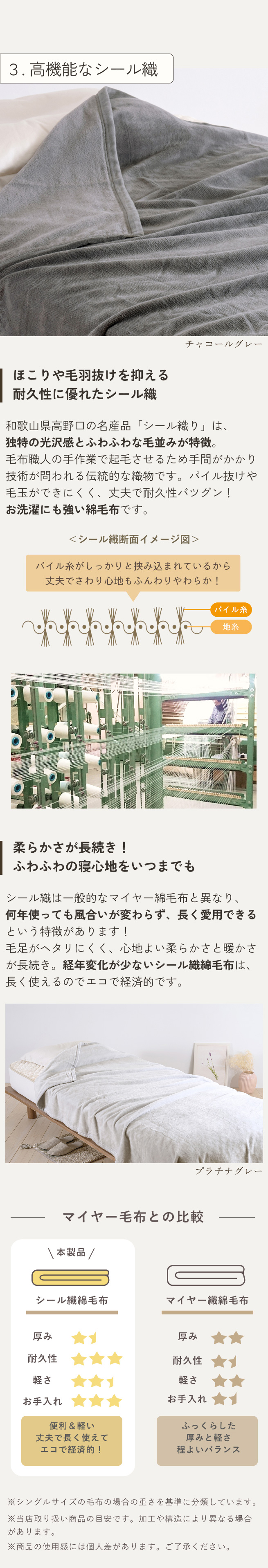 すべて日本製!和歌山県高野口から世界に誇る技術が詰まった高野口の工場で、伝統の技を駆使し、1枚1枚丁寧に製品化されています。熟練した職人の手作業によってよこ糸を引き抜くことで、両面パイルの毛布になります。使用するお客様のことを考え、細かな所までこだわり尽くした商品です。