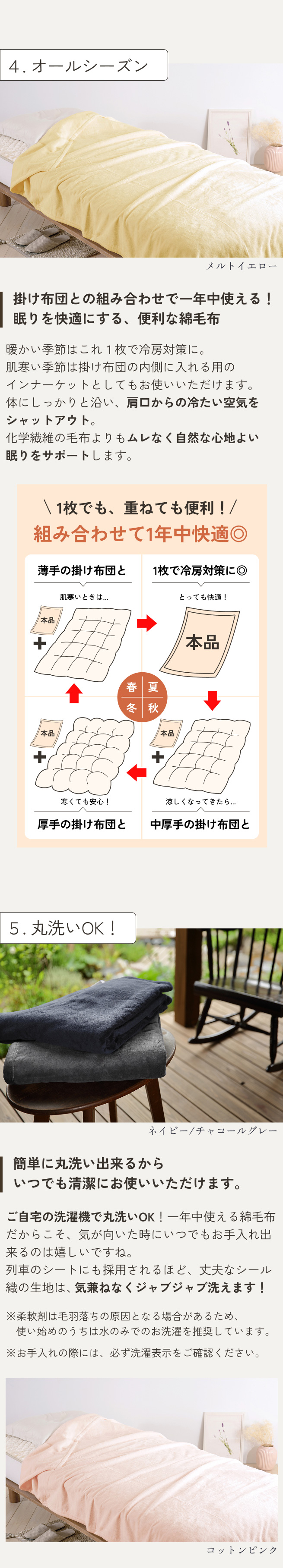 しかも、タンブル乾燥もOKなので、仕上がりはふんわり、時短にもおすすめの綿毛布です。