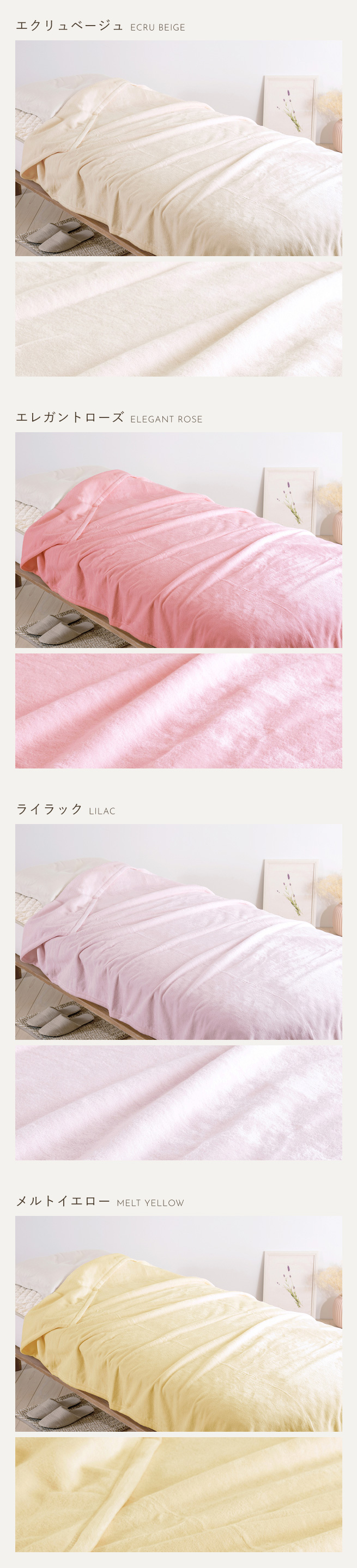 素肌にやさしいシルキータッチ肌ざわりの良さが特に優れ、デリケートなお肌をやわらかく、やさしく包みこみます。また静電気が起こりにくく、ぐっすりと心地よい眠りが得られ、一晩中快適です。赤ちゃんからお年寄りまで、肌の弱い方にも安心してお使いいただけます。