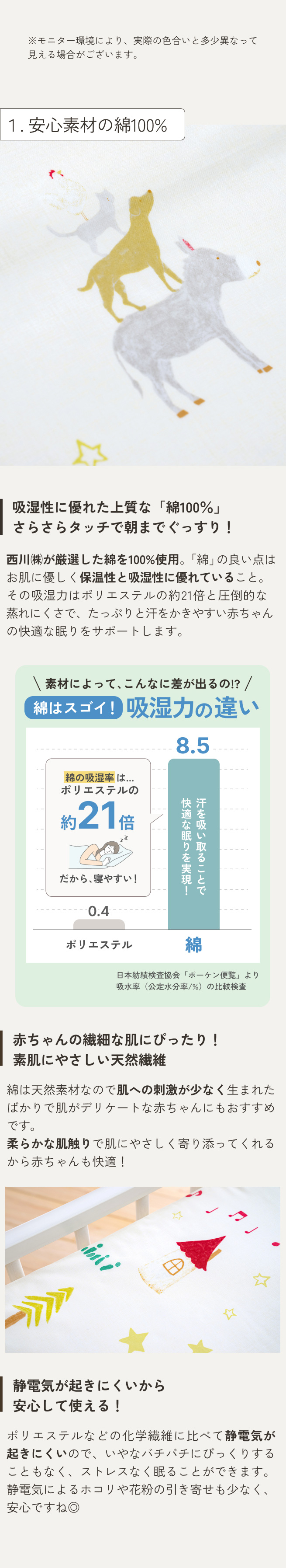 カバーは赤ちゃんの肌に直接触れるもの。だからこそ、吸湿性・発散性に優れた綿100%生地がおすすめです。ストレスのない自然な肌ざわりは、お肌の弱い赤ちゃんにも安心!