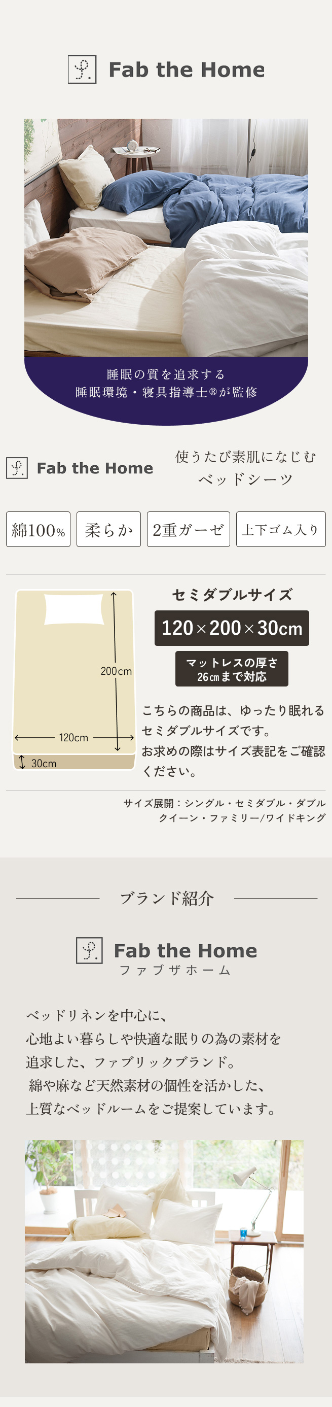 ◆商品名:Fab the Home〜ダブルガーゼ〜ベッドシーツ セミダブル ボックスシーツ 二重ガーゼ/120×200cm用