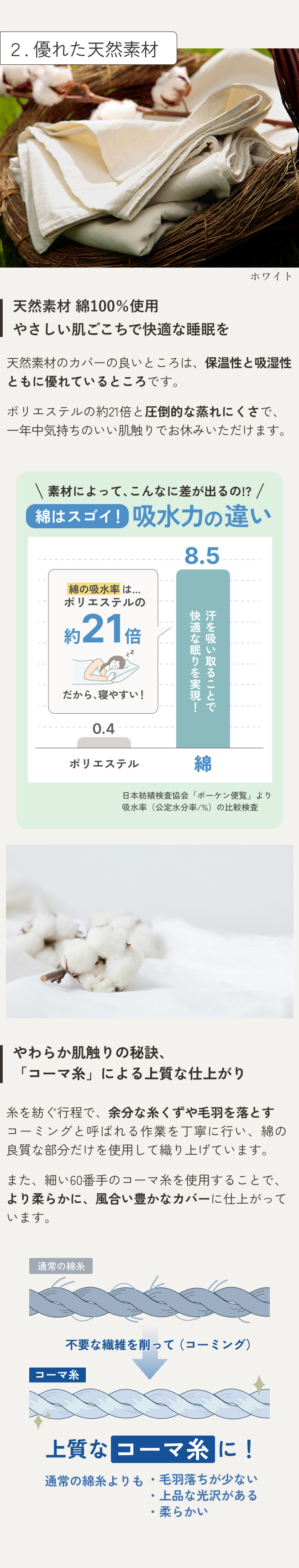 吸湿発散性に優れているので夏はサラリと爽やかな使用感。また二重織り組織が空気を保ち、冬も心地よい暖かさです。1年を通して寝床を快適にしてくれる優れもの。