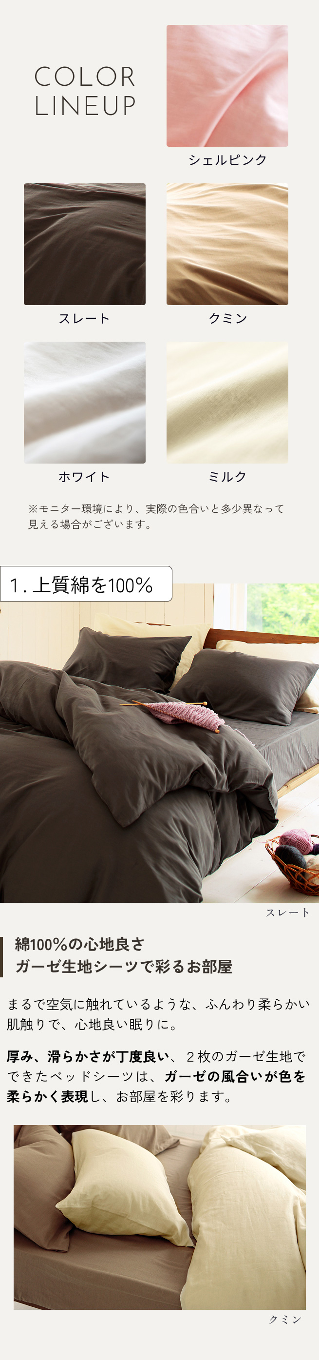 ふんわり綿100%の優しい素材ガーゼを二重にした、適度な厚みのあるベッドシーツです。
