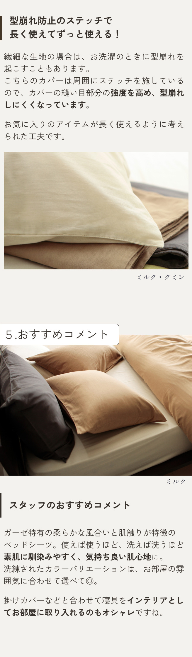 やわらかくて優しい肌ざわりのガーゼ素材は、お洗濯をする度にふんわりとした触り心地になるのが特徴です。使い込むほどに素肌になじみ、あなただけの肌ざわりに変化していきます。使えば使うほど、触り心地がよくなっていきます。