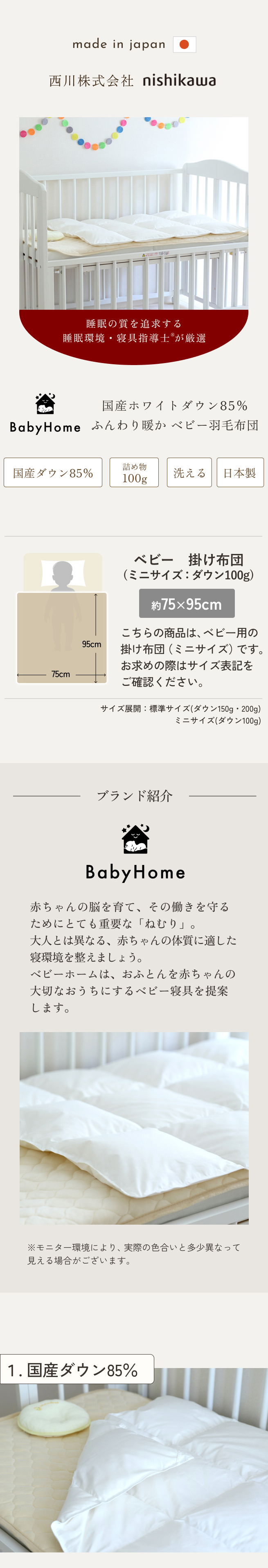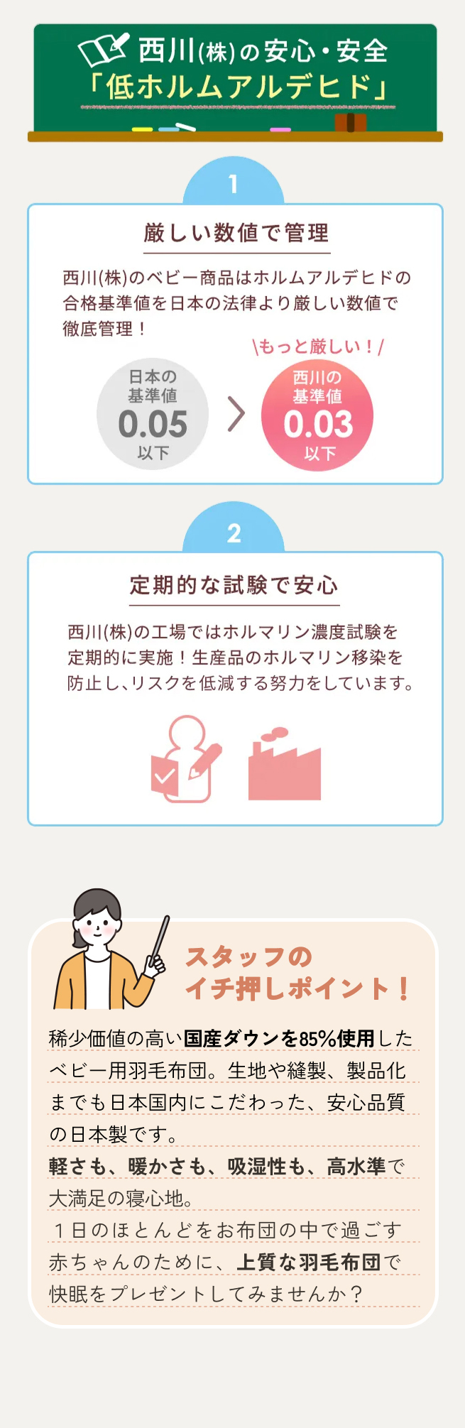 ふんわり軽くて心地いい。健やかな眠りのため、大切な赤ちゃんに使ってほしい逸品。安心の品質、西川株式会社の日本製です。