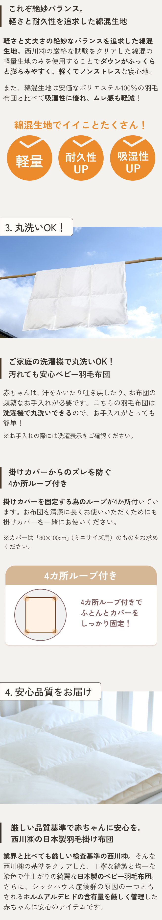 西川株式会社の、国内で仕立てた羽毛布団です。大切な赤ちゃんのため、良いものを選んであげたい。そんなご家族の『願い』と赤ちゃんにとって、とても大切な『眠り』をそっとサポート。安全性、機能性、快適性に優れた寝具を選んであげましょう。