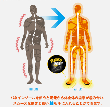 本来人間の身体は、衝撃を効率よく分散したり、負担をかけないようにバランスよく機能するものです。しかし近代的な環境で生活しているうちに、現代人の骨格はゆがみ、本来の機能を充分に発揮できない傾向が見られます。バネインソールでは、そのようなバランスを崩した足元の骨格を組み上げ、全身のゆがみを整えることができます。骨格が正しく整うことで、人間が本来持っているバランスを取り戻し、今まで以上のパフォーマンスを体感したり、トラブルを改善することができます。