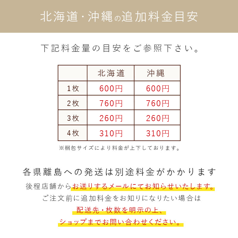 ご注文前に追加料金をお知りになりたい場合は配送先・枚数を明示の上、ショップまでお問い合わせください。