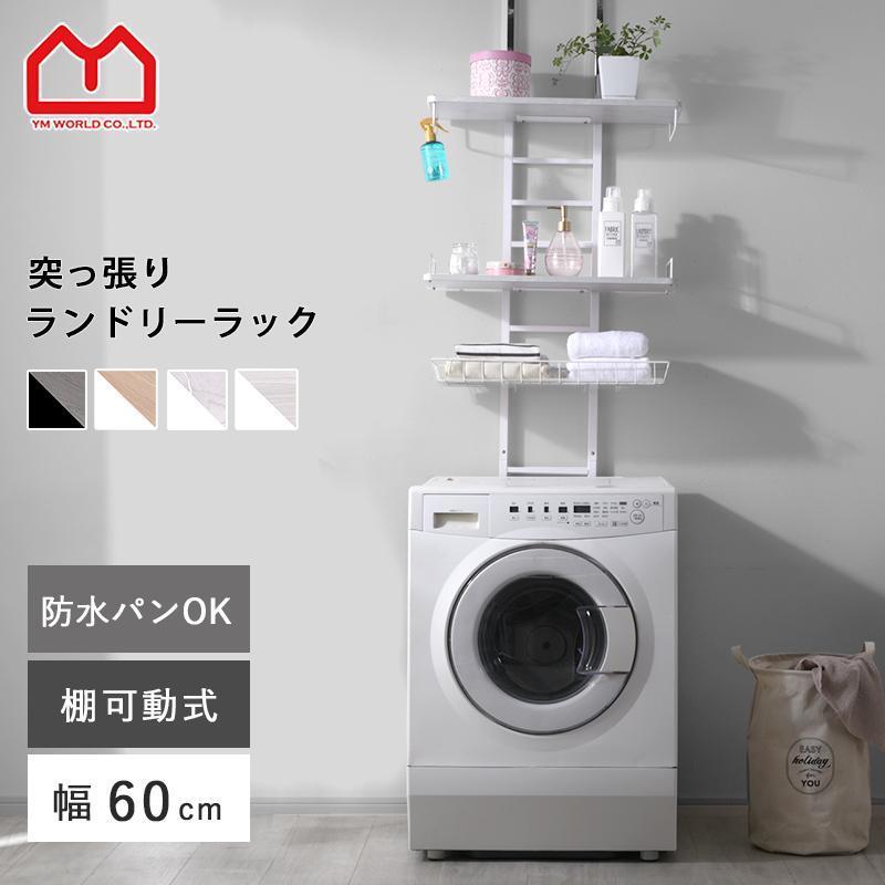 つっぱり ランドリーラック 幅60 3段 バスケット付 防水パン対応 伸縮 棚 洗濯機 突っ張り ラック スリム おしゃれ ランドリー収納 引っ掛け カゴ付き 防水パン