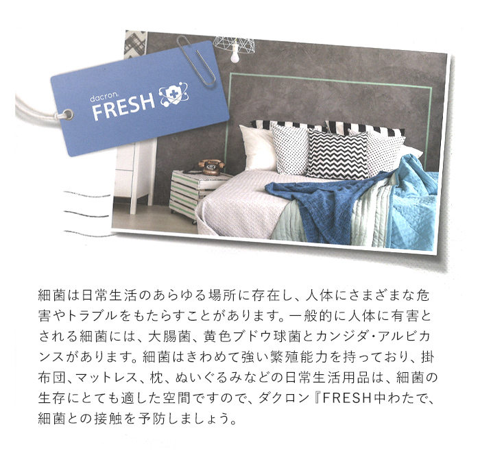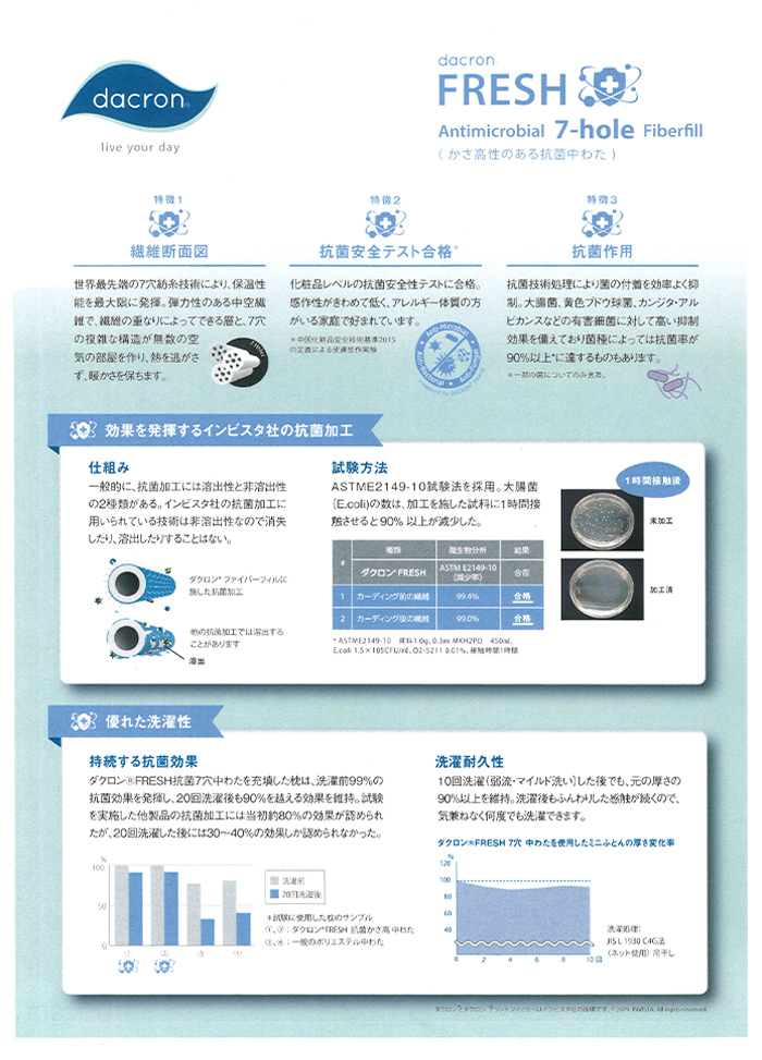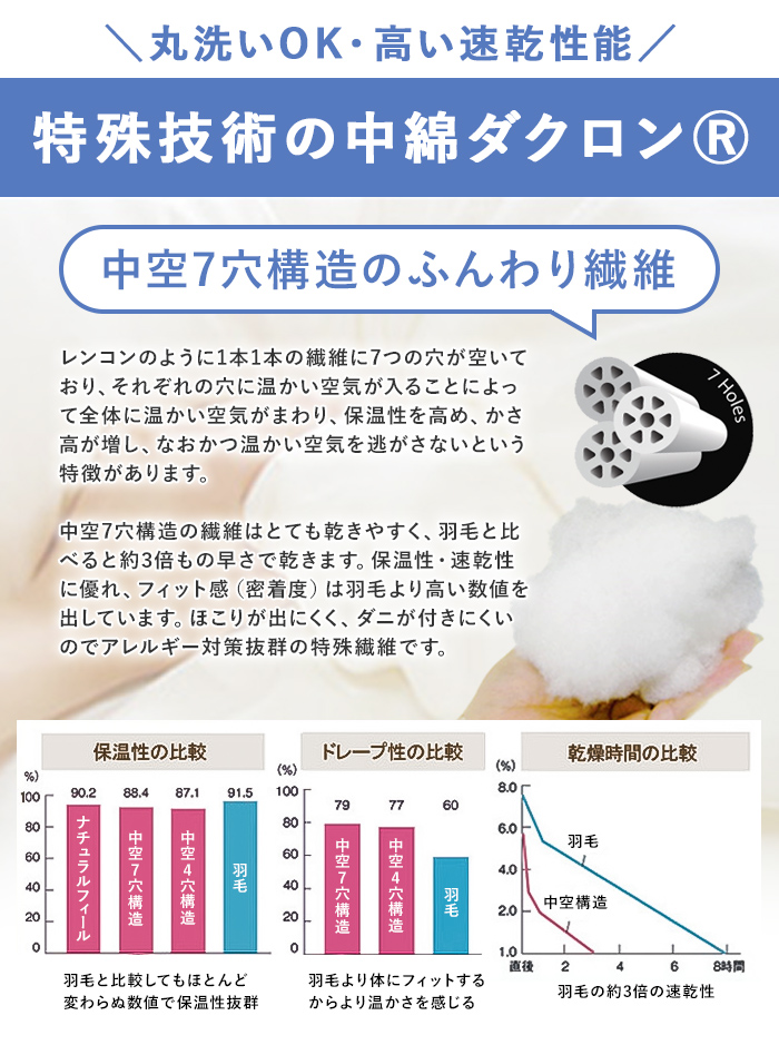 | 【肌掛け・合掛け】 側生地:ポリエステル80%・綿20% 中綿:ポリエステル100%(7-HOLE・中空7穴構造) |