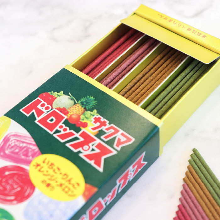 昔から変わらないおなじみのパッケージが目を引く、サクマドロップスの4種のフルーツ(いちご・りんご・オレンジ・メロン)の香りが楽しめるミニ寸のお線香です。