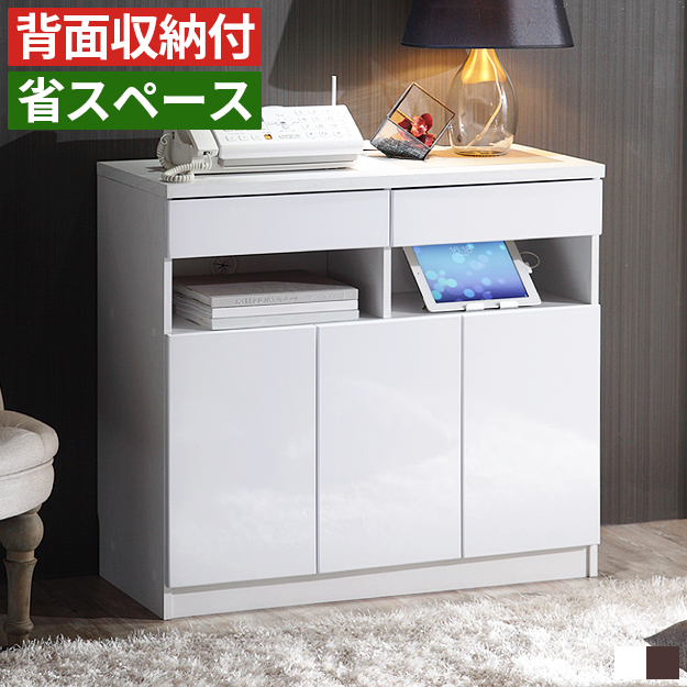 電話台 ルーター収納 キャビネット チェスト リビング 収納 プリンター おしゃれ 北欧 白 ホワイト 幅90cm 90幅 高さ80cm スリム 薄型 ワイド 大容量 プリンター台 Fax台 ファックス台 モデム ルーター Wi-Fiルーター ワイファイ 中継器 ラック 棚 収納棚 リビングチェスト リビングキャビネット リビングボード サイドボード サイドキャビネット リビング収納 収納家具 背面収納付き 配線収納 コード収納 木製 引き出し 扉 鏡面仕上げ 寝室 シンプル モダン