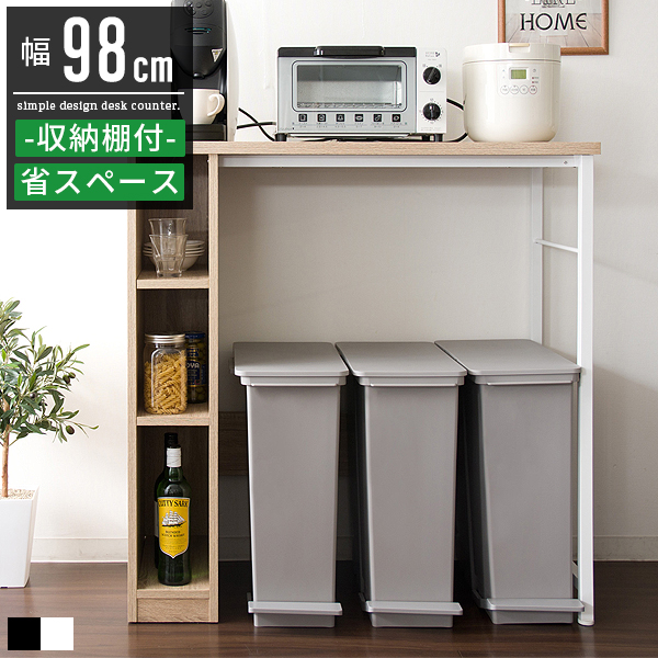 幅98×奥行45×高さ100cmのスリムでハイタイプなキッチンカウンターは、作業がしやすい天板と収納棚があり、壁面でも対面でもお使いいただけます。ごみ箱を入れても上にたっぷりと余裕があるオープンスペースや高さの変えられる収納棚、2つのコンセント付きなど汎用性が高く使いやすいのが特徴です。カラーはブラウンとナチュラルの2カラーでどちらも主張しすぎず、おしゃれなカフェのように演出してくれます。