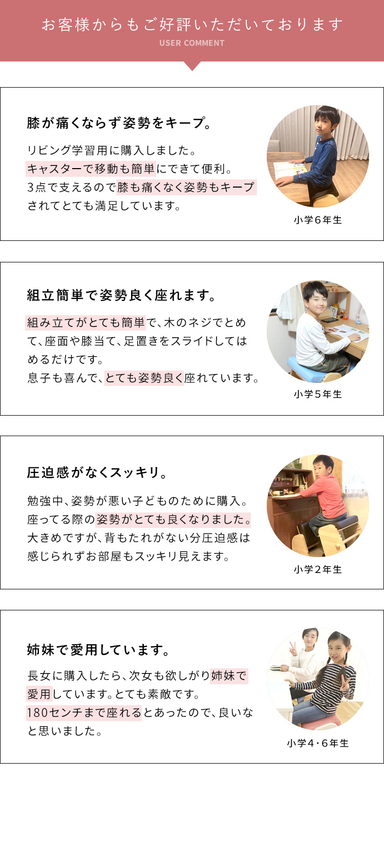 長時間の使用でも膝やすねが痛くなりにくく、楽に座れるようになりました。