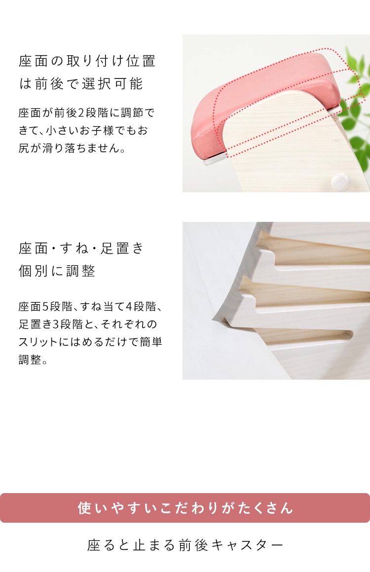 座面は前後2段階に調節でき、小さいお子様でもお尻が滑り落ちない仕様に。