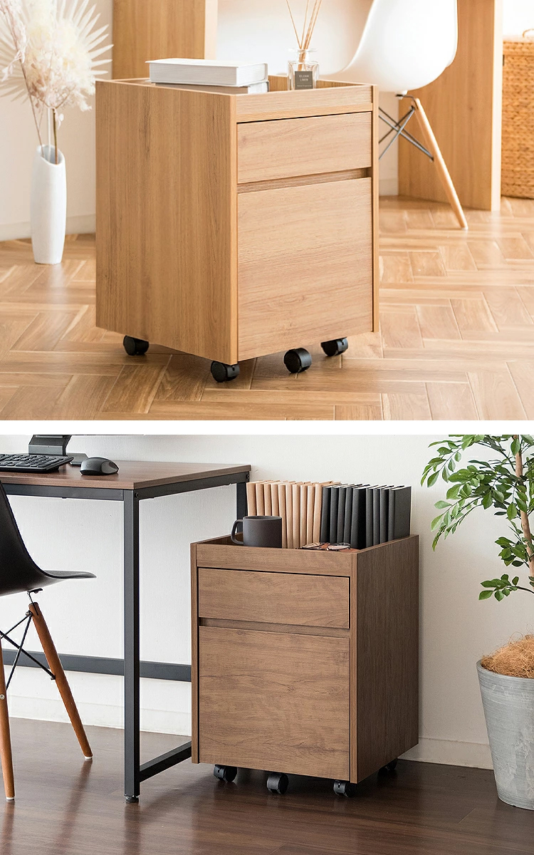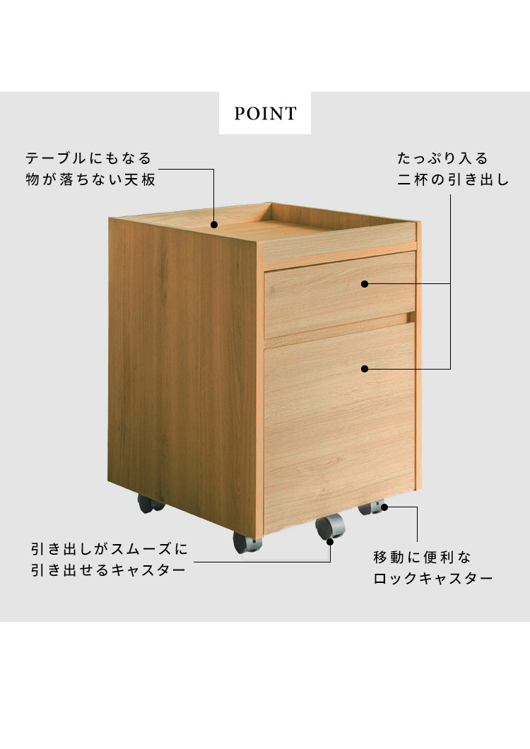 デスク周辺ではデスク横やデスク下に置いて書類や文房具を収納できるデスクワゴン。