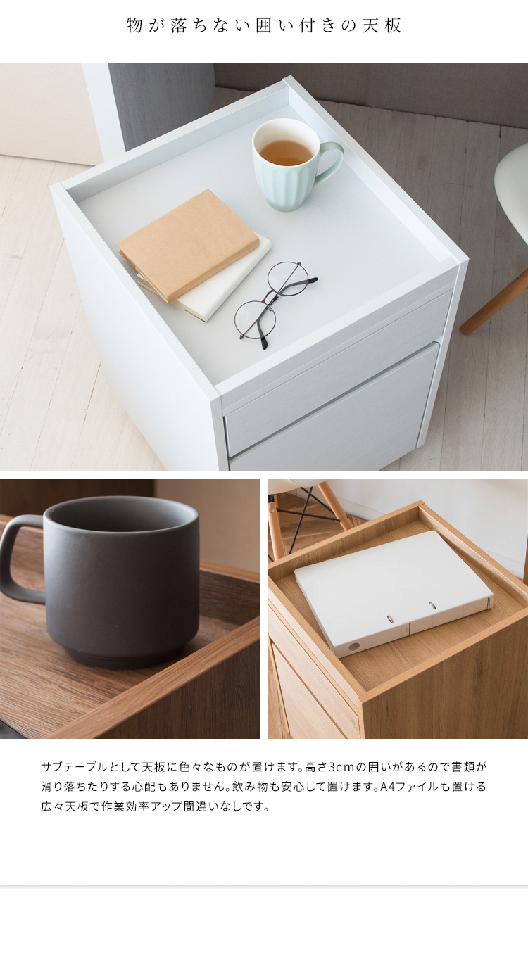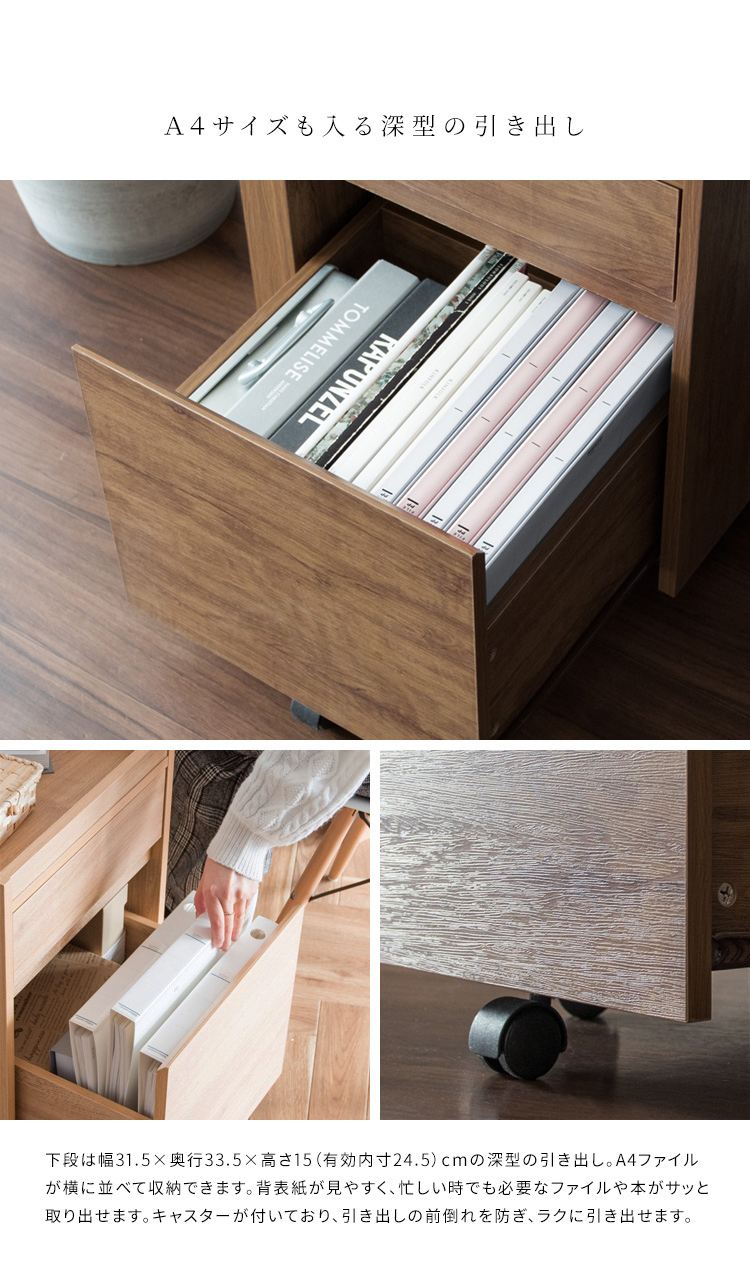 深さの異なる2つの引き出しはA4ファイルも収納できるサイズ。