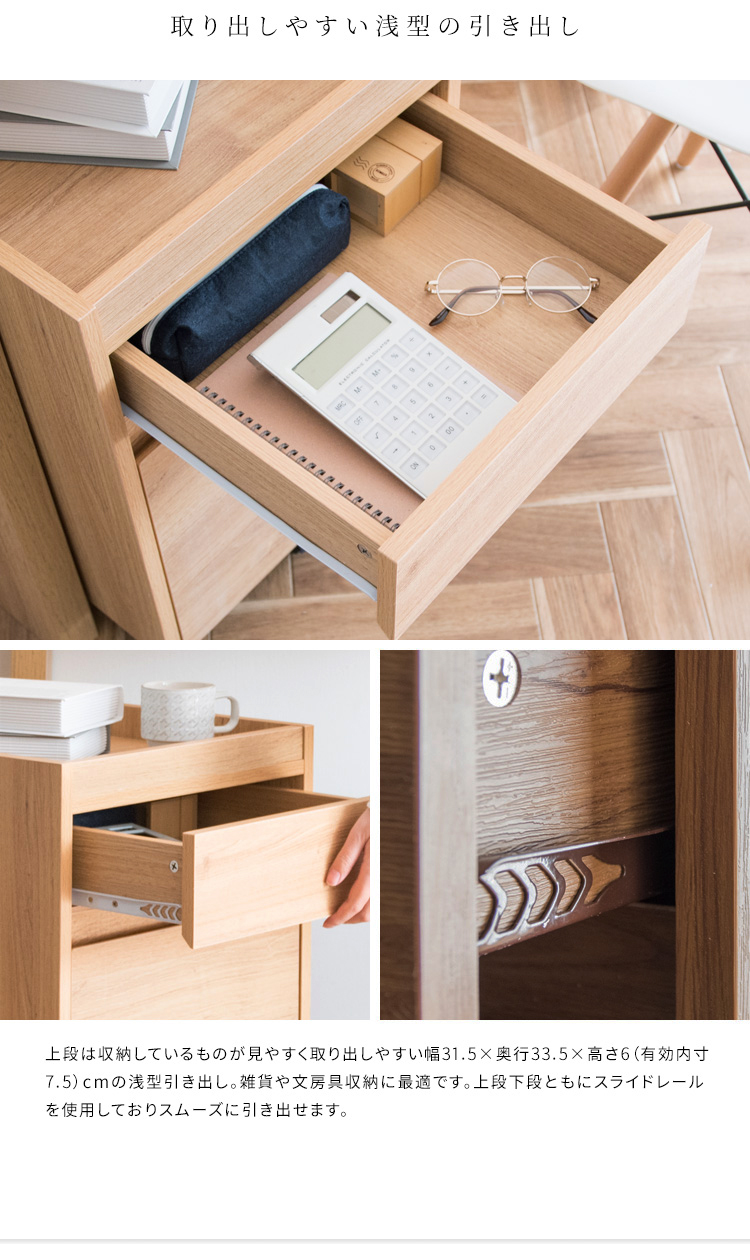 上段は収納物が取り出しやすい幅31.5×奥行33.5×高さ6cm(有効高7.5)の浅型引き出し。