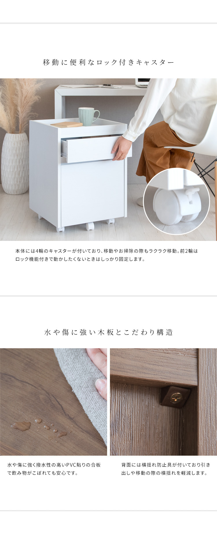 キャスターが付いているので引き出しの前倒れを防ぎラクに引き出せるよう仕様です。