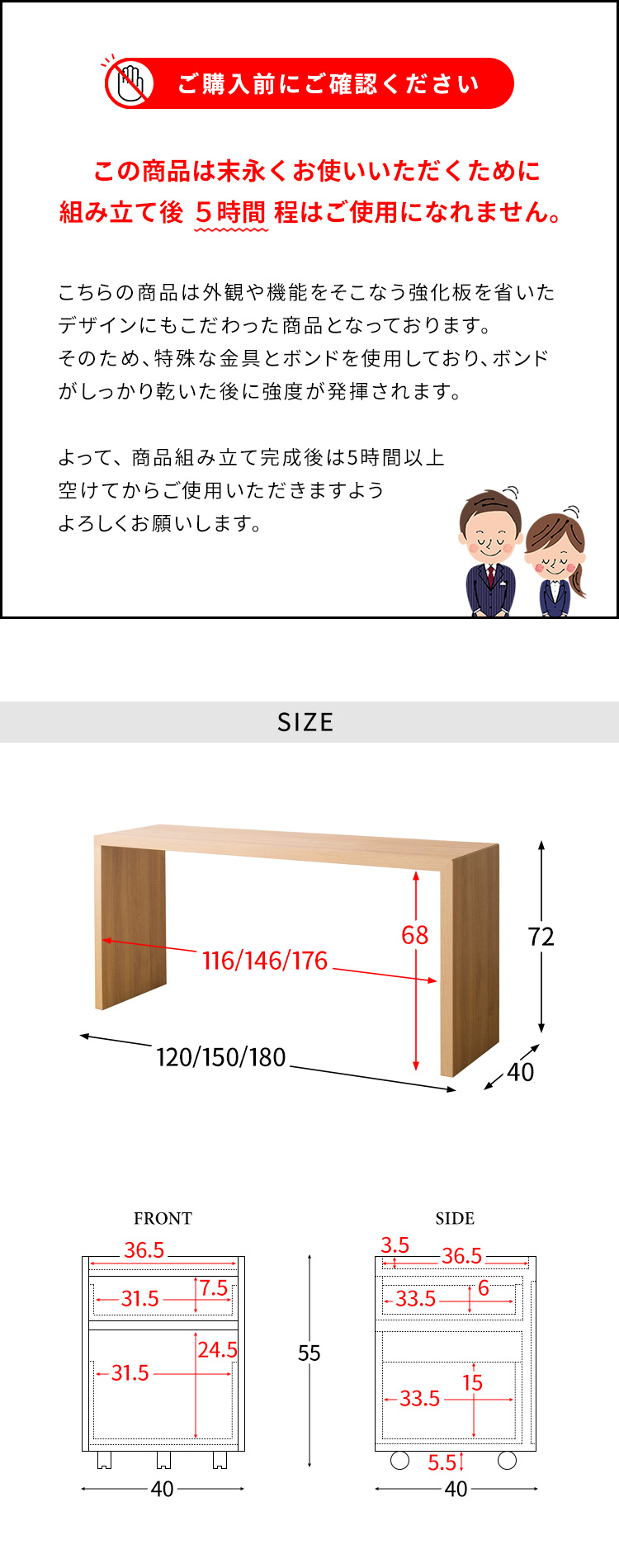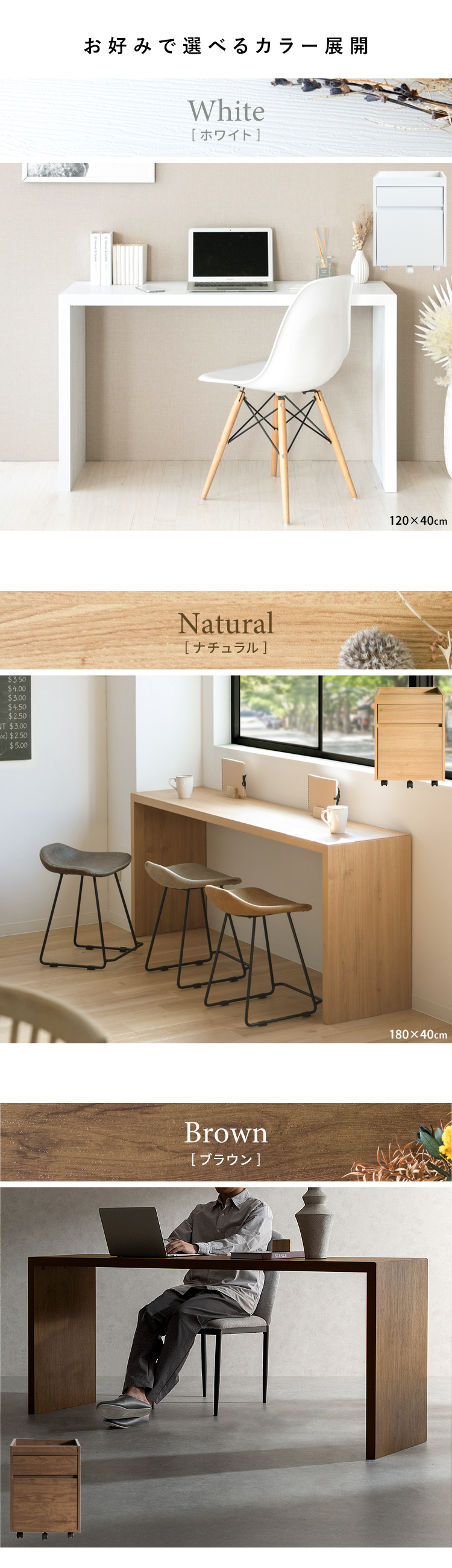 ・デスク:幅120/150/180×奥行40×高さ72cm