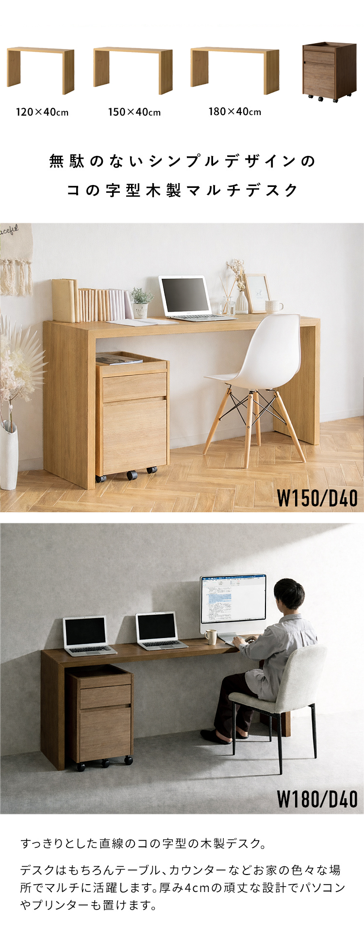 すっきりとした直線のコの字型の木製デスクとワゴンの2点セット。シンプルなデザインはデスクだけでなくテーブル、カウンター、ディスプレイスタンドなどお家の色々な場所でマルチに活躍します。厚み4cmの頑丈な設計でパソコンやプリンターも置けます。