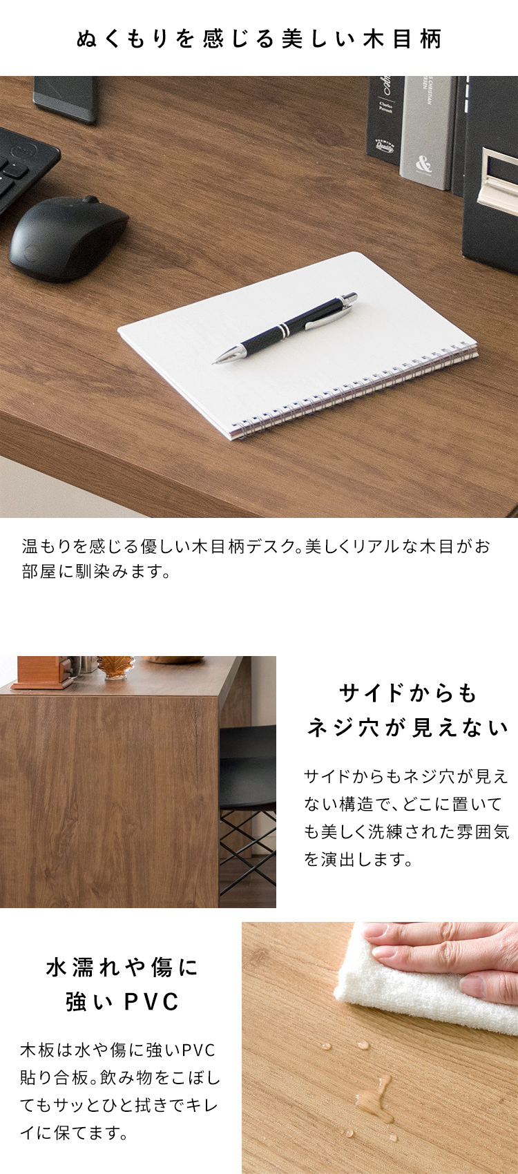 温もりを感じる優しい木目柄デスク。美しくリアルな木目がお部屋に馴染みます。
