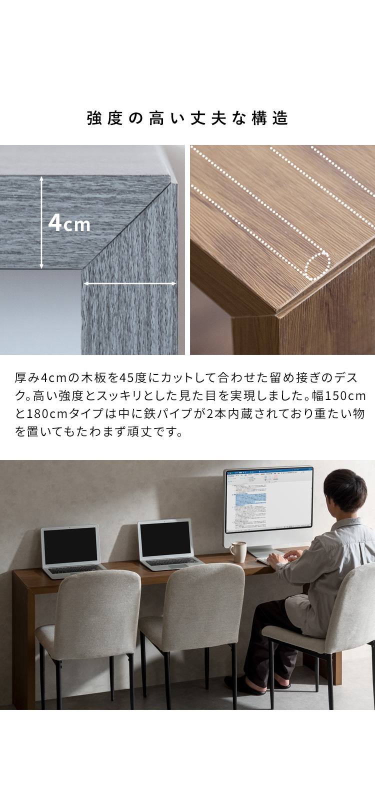 厚み4cmの木板を45度にカットして合わせた留め接ぎのデスク。
