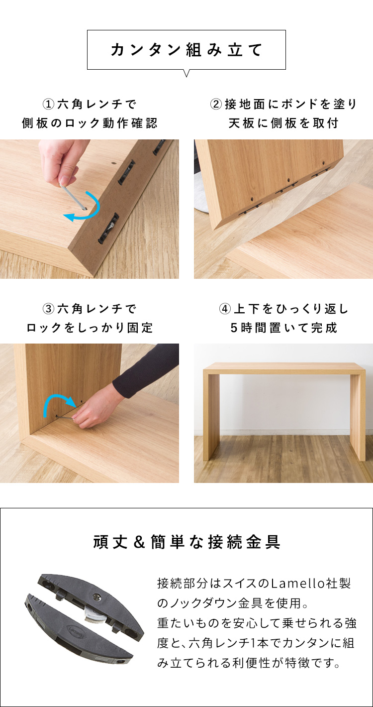 重たいものを安心して乗せられる強度と六角レンチ1本でカンタンに組み立て可能。