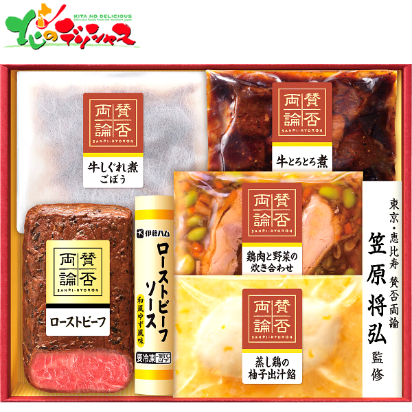 ■商品内容:賛否両論(ローストビーフ(もも)210g、牛とろとろ煮・蒸し鶏の柚子出汁餡・鶏肉と野菜の炊き合わせ各150g、牛しぐれ煮ごぼう55g)、ローストビーフソース和風ゆず風味60g