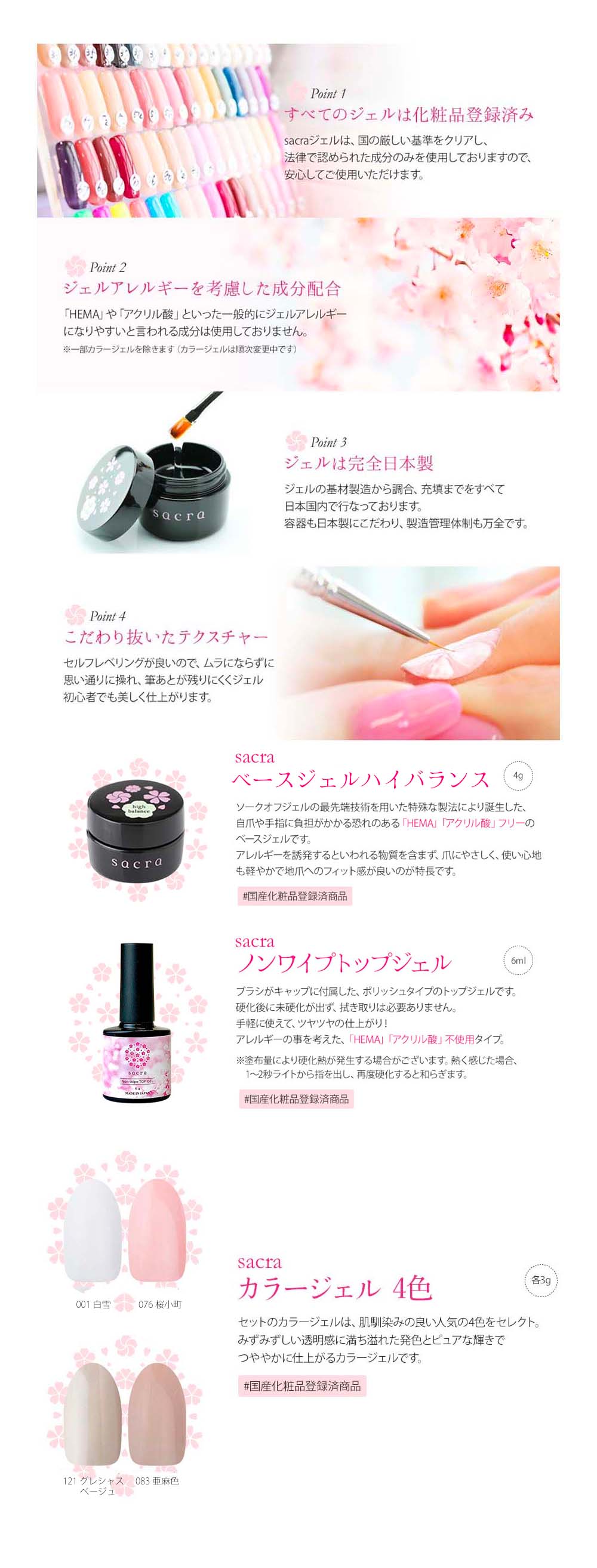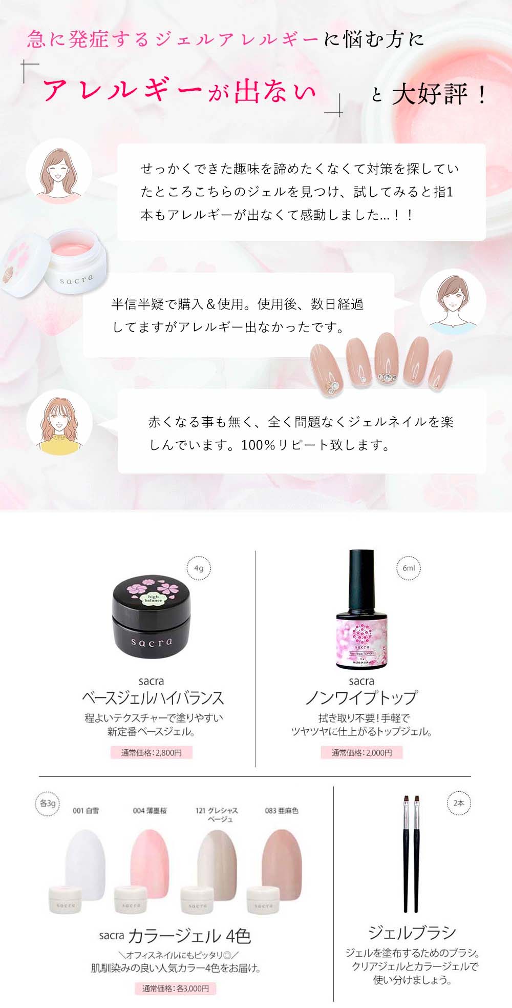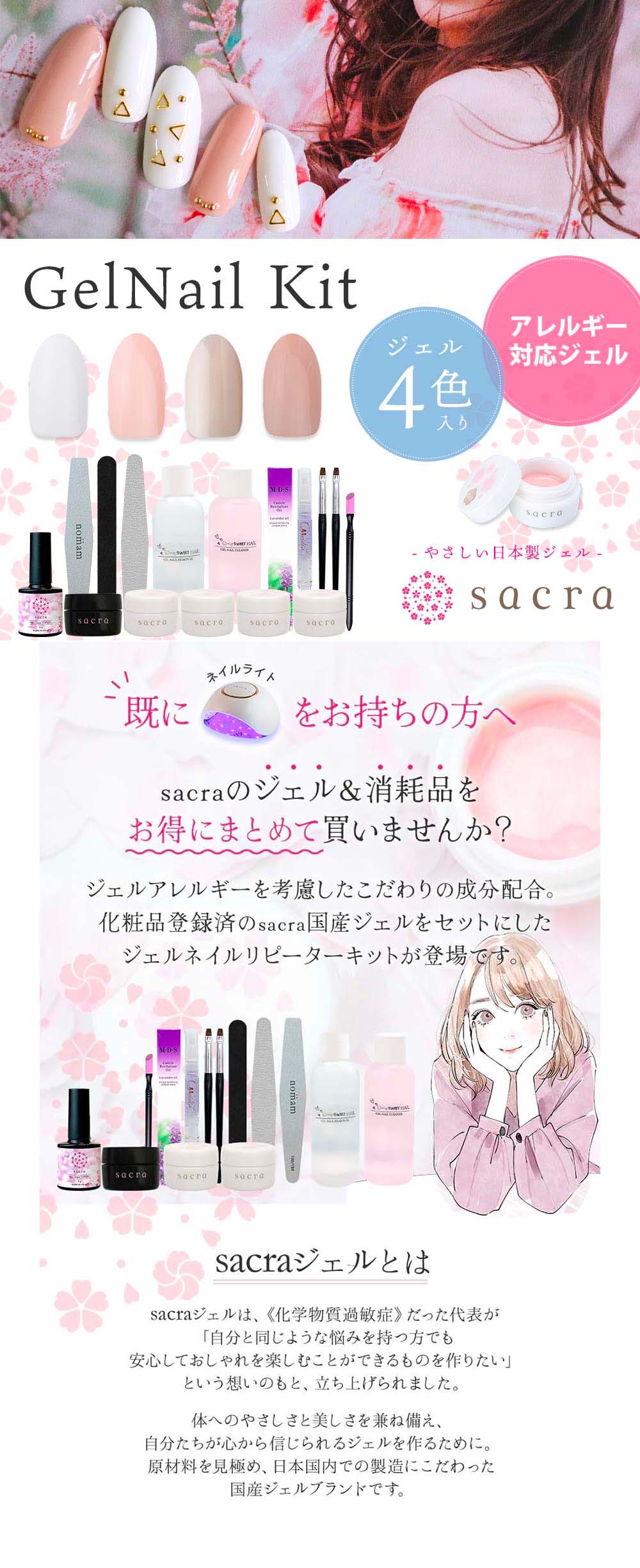アレルギー対応で人気の『sacra』のジェル&ネイルツールをまとめてお届け! ■sacraとは プレパレーション(下準備)から、基本の塗り、ジェルの除去(オフ)に必要なものが全て揃っているので届いてすぐに始められます。 | |