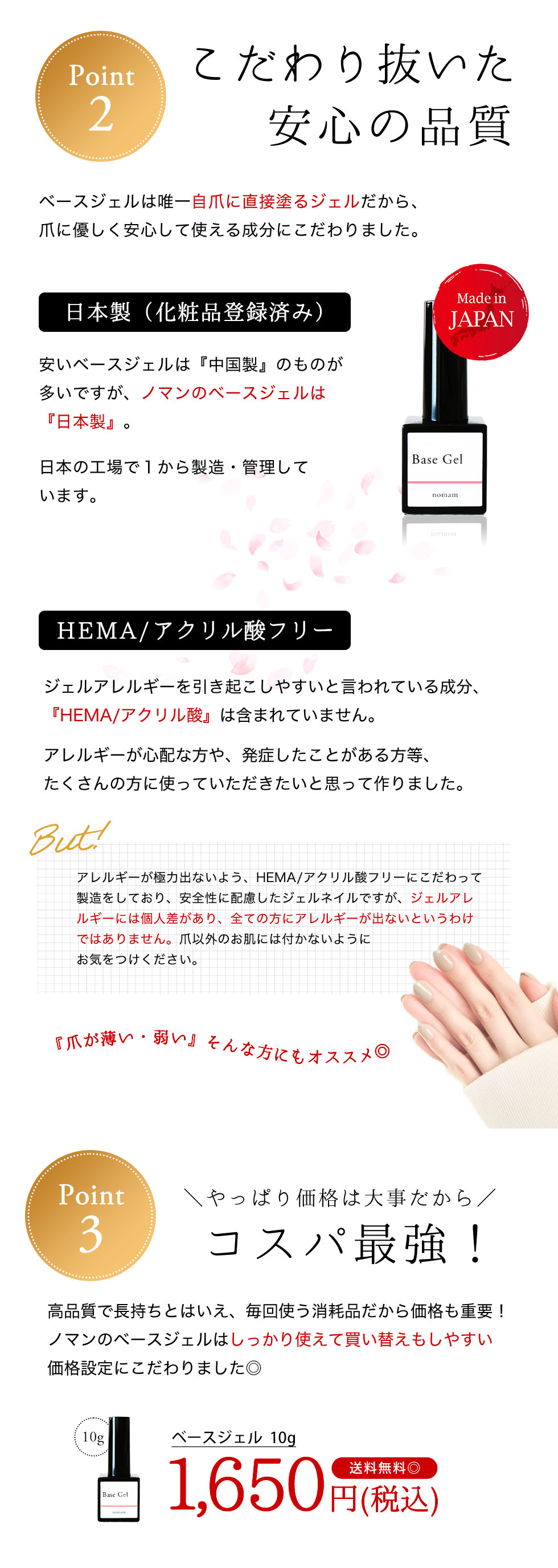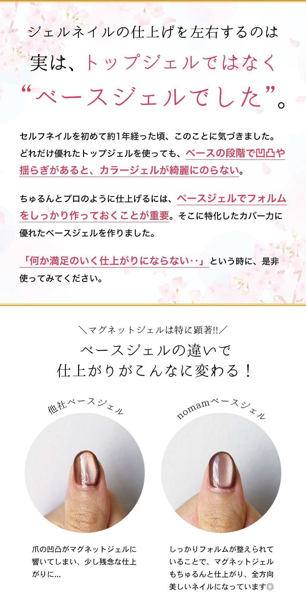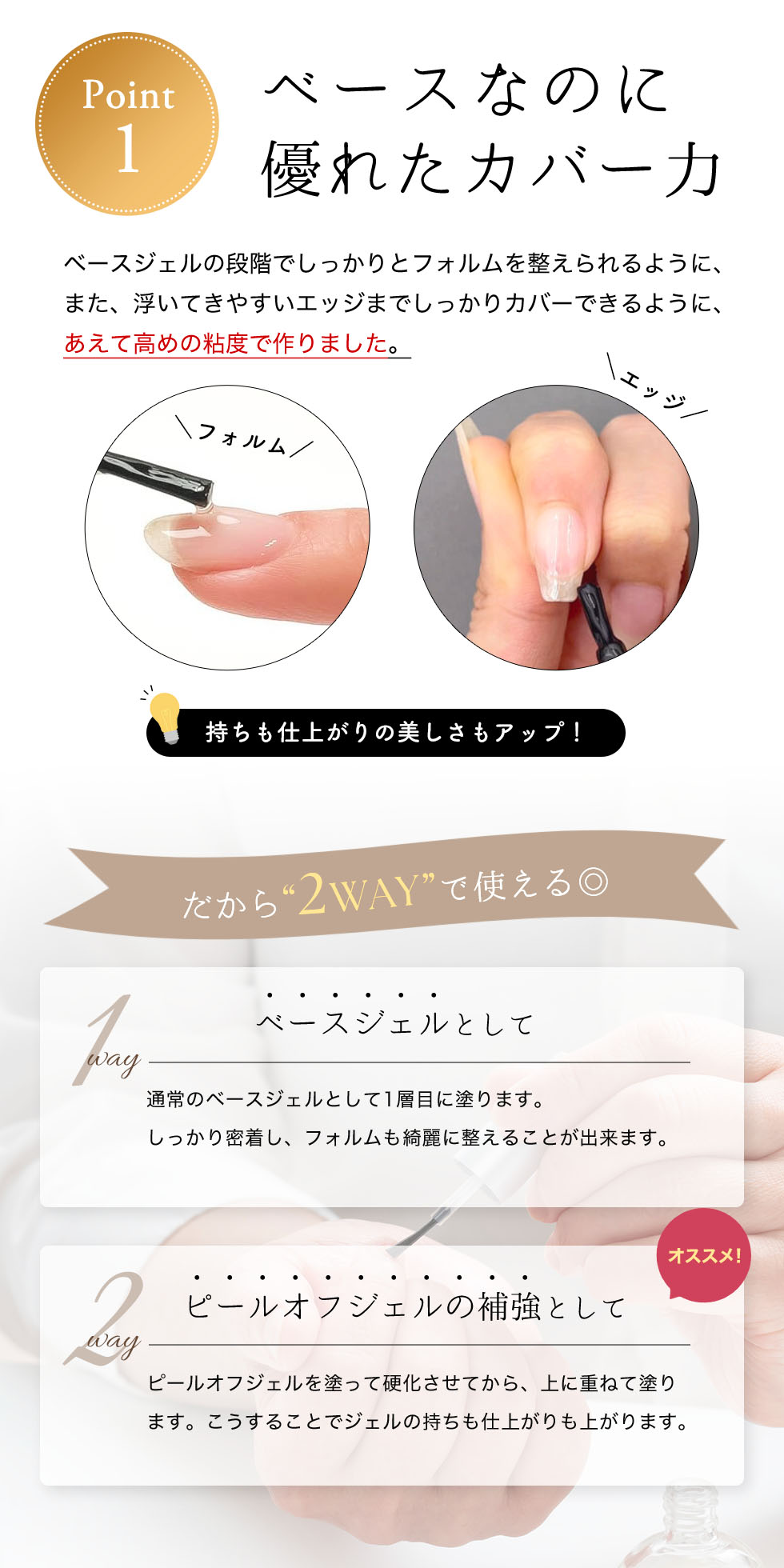 通常のベースジェルとしてはもちろん、ピールオフジェルに重ねて塗り、補強として使うことも出来る2WAYのベースジェル。 | |