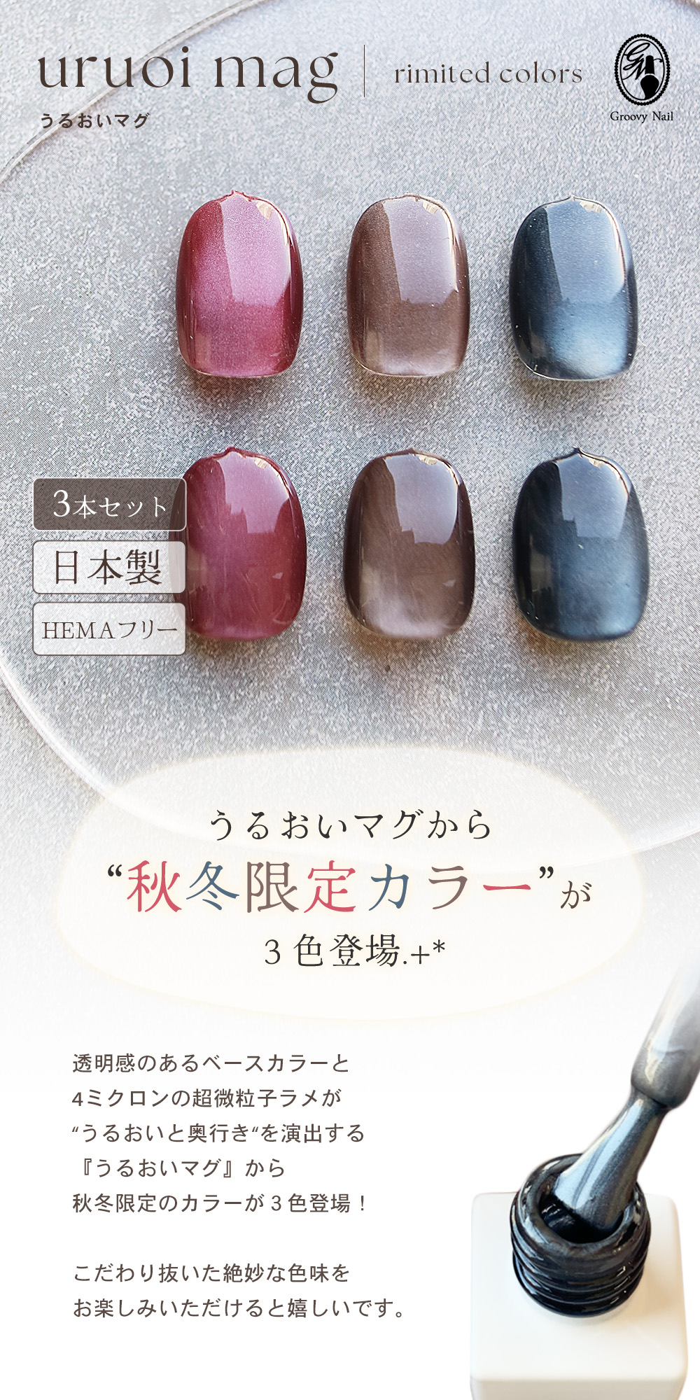 nomam(ノマン)の『HEMA・アクリル酸フリー』のマグネットジェル「うるおいマグ」からこっくりカラーが可愛い3色が登場しました◎ | |