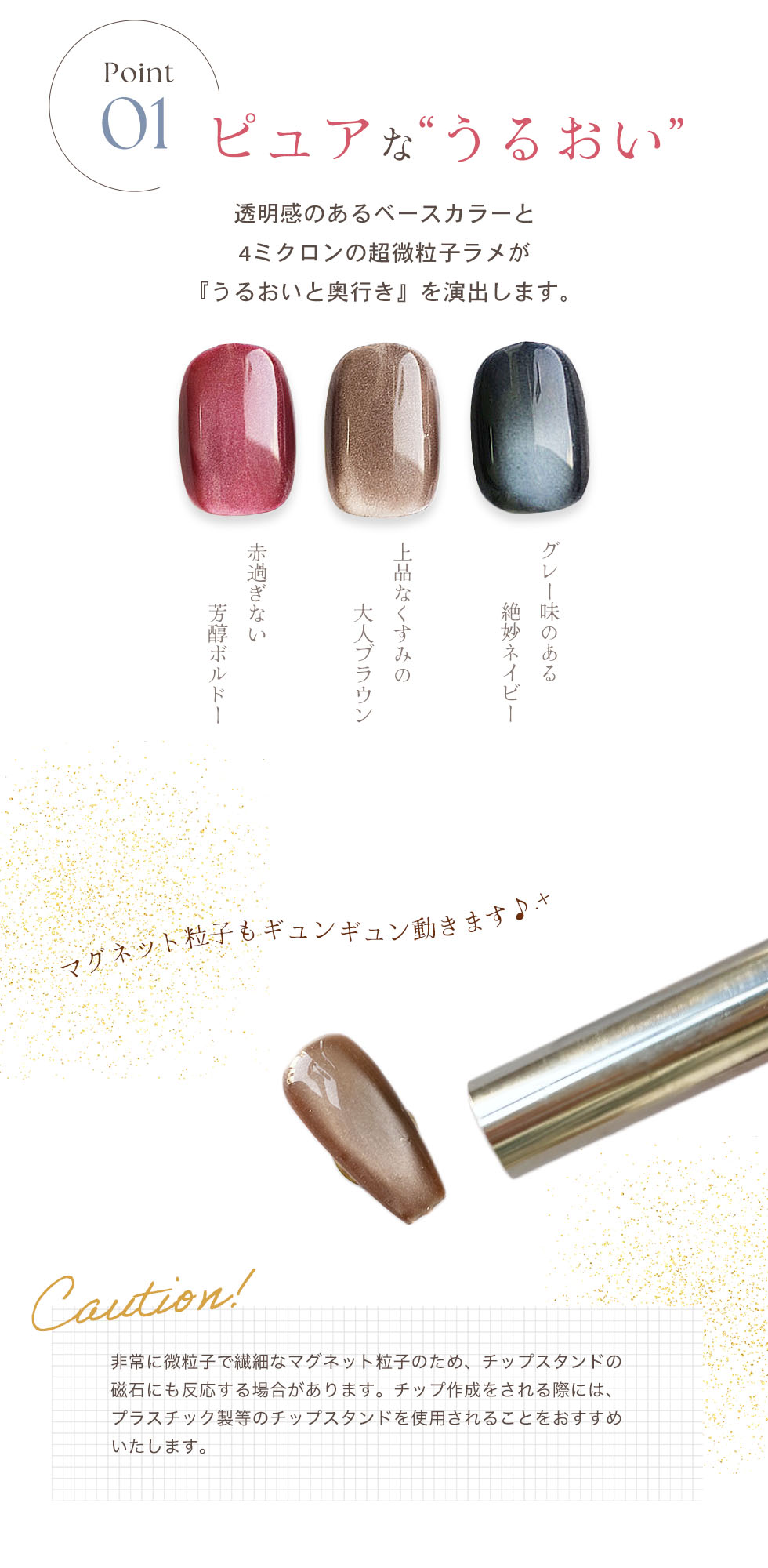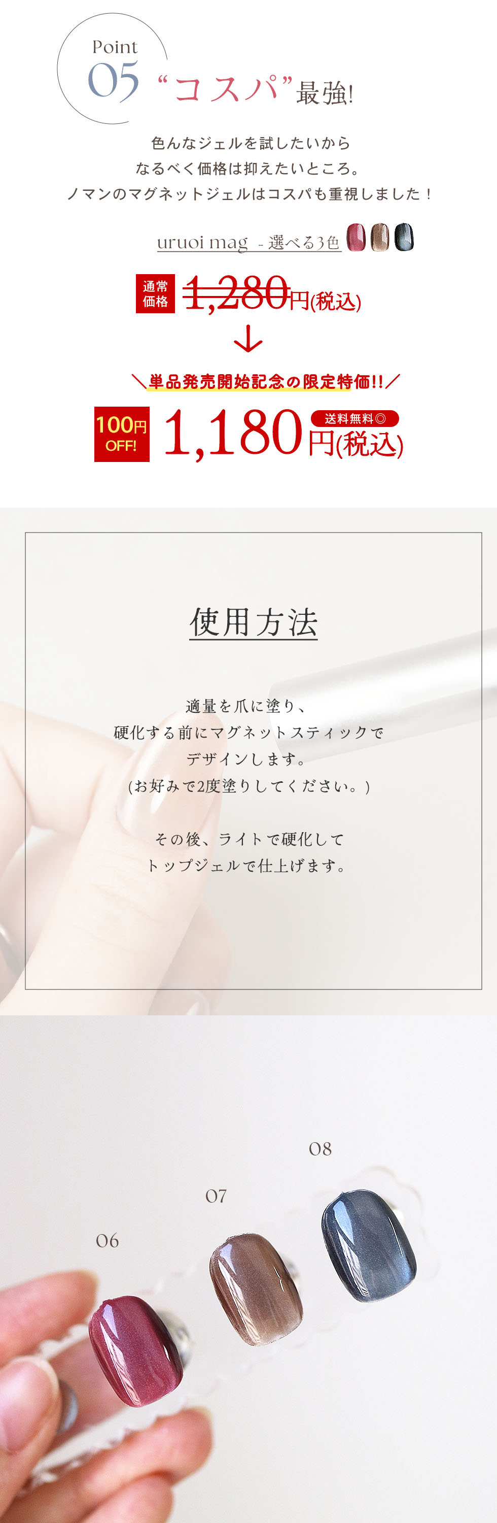 | 使用方法 | ジェルを塗布後、硬化させる前にマグネットスティックで光をデザインします。その後ライトで硬化させて下さい。 |