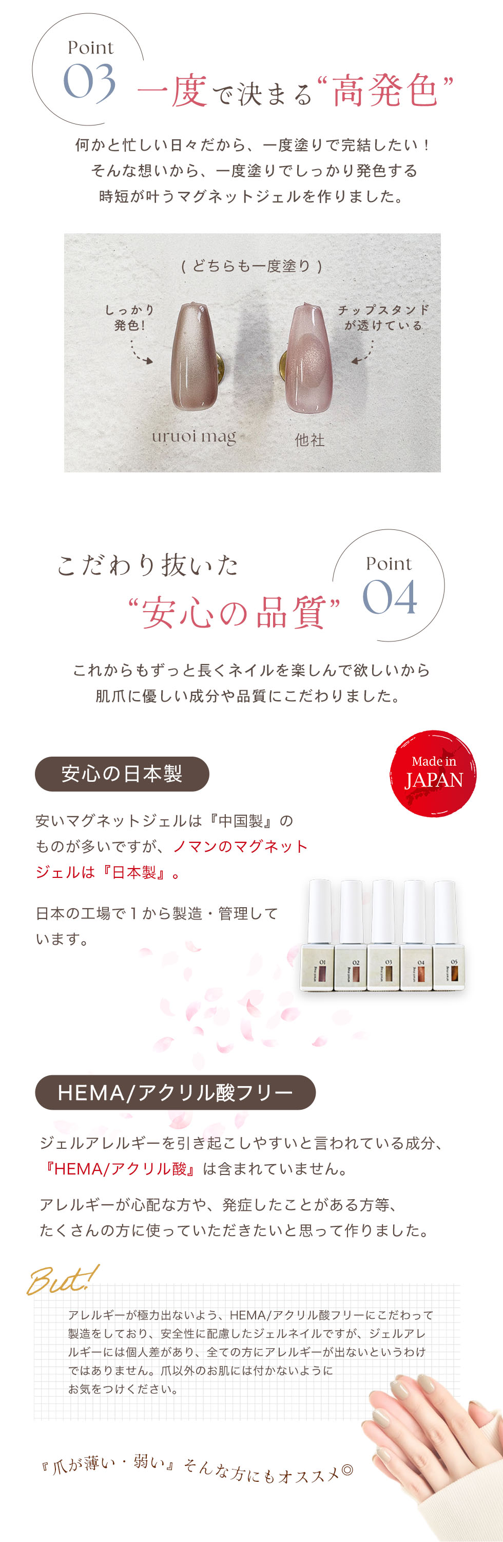 | 注意事項 | べースジェル塗布後、2層目にご使用ください。 |
