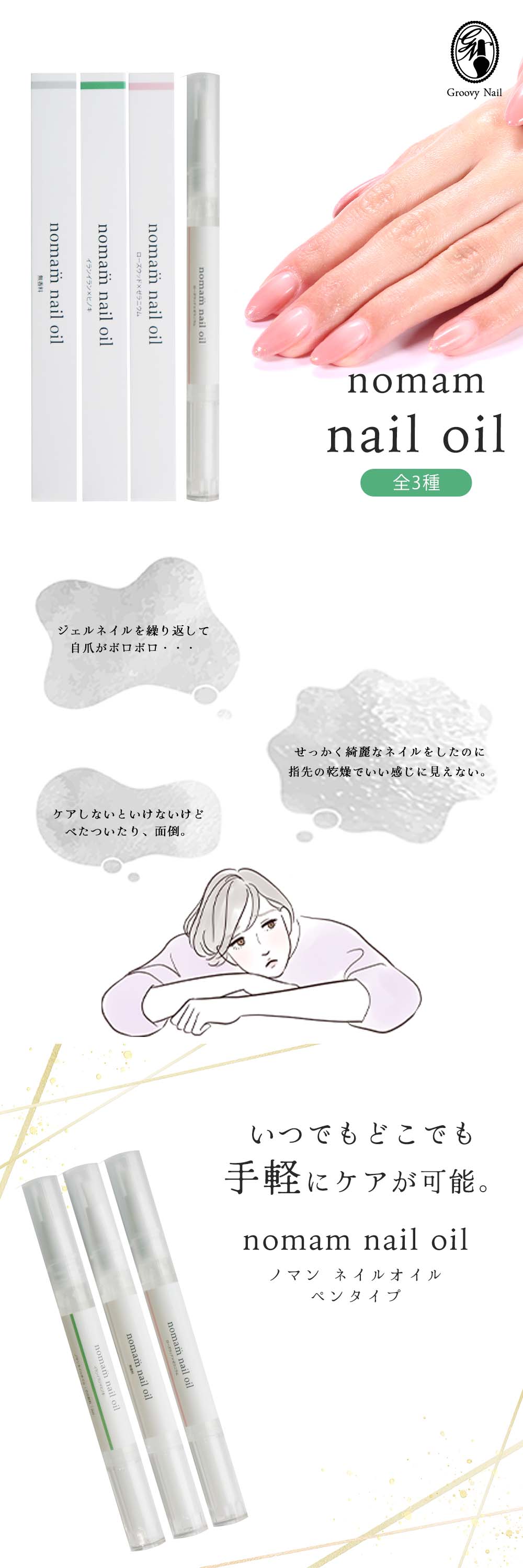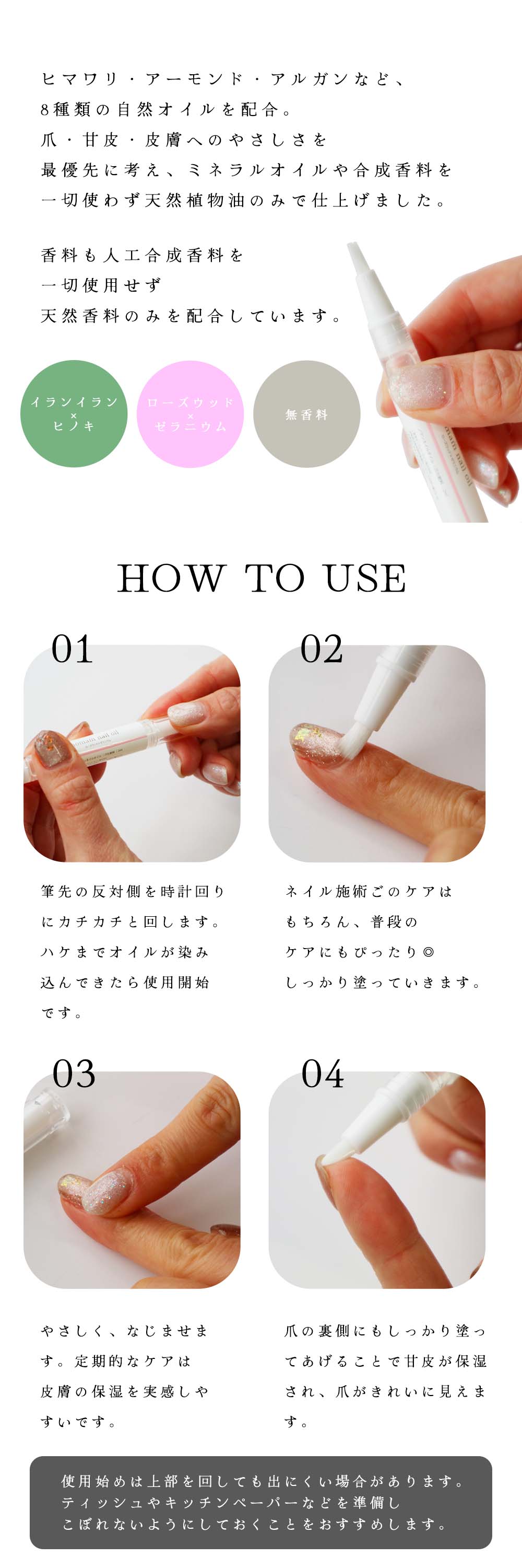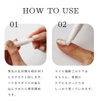 | 使い方 | 筆部分を下に向けて、反対側のグリップを3〜4周ほど回して下さい。しばらくするとオイルが筆から出てきますので、甘皮、爪など指先の先端部分につけて、しっかりとマッサージをして下さい。 |