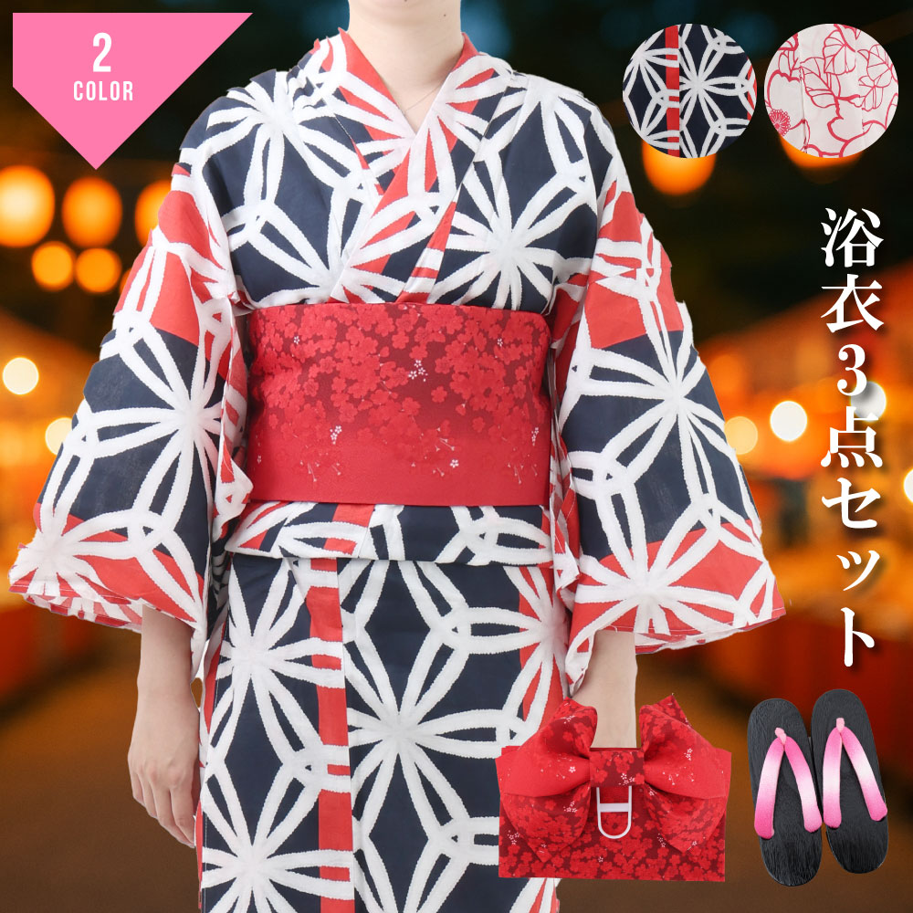 浴衣 セット レディース 浴衣3点セット 大人 ゆかた レトロ モダン 粋 古典柄 簡単着付け 一人で着れる つくり帯 付け帯 下駄付き 帯