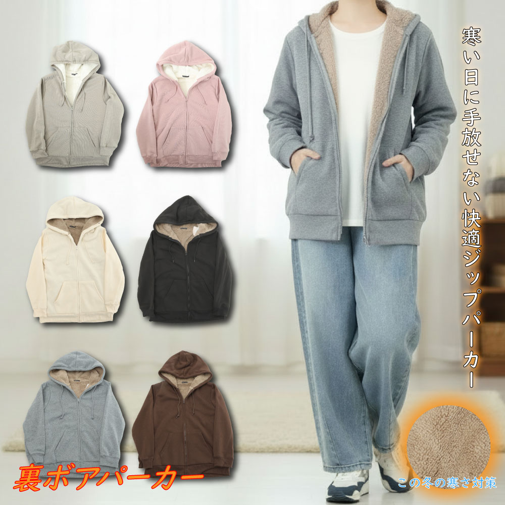 裏ボア パーカー レディース 裏起毛 ジップパーカー M L 防寒 冬 暖かい かわいい 無地 グレー ピンク ブラック ブラウン オフホワ