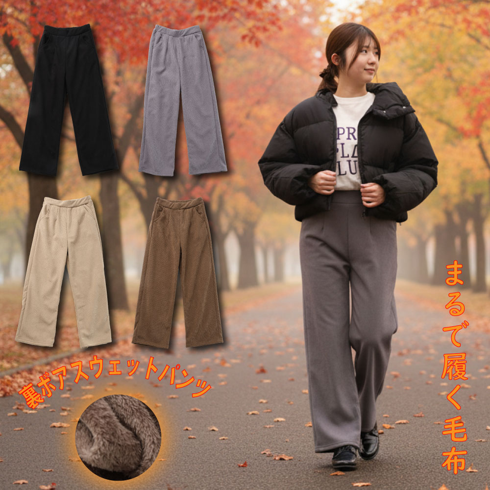 冬の冷えから脚を守る、総裏ボア仕様の超あったかワイドパンツ。内側全体にふわふわのボアを敷き詰め、まるで毛布のようなぬくもりを1日中キープ。ストンと落ちるワイドシルエットで着膨れしにくく、すっきり脚長に見えるのも嬉しいポイント。ウエストはゴムでラクちん、両サイドポケット付きで機能性も抜群。カラーはベージュ・ブラック・グレー・ブラウンの4色、サイズはM・L・LLの3展開。寒い日の強い味方になる、冬の定番ボトムスです。