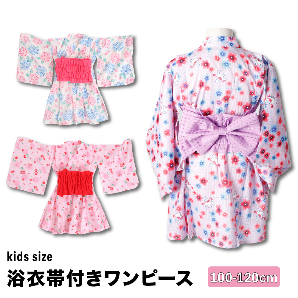 キッズ 浴衣ワンピース 帯付き 女の子 浴衣 ワンピース 夏祭り 盆踊り 花火 100 110 120 子供 浴衣セット ラベンダー 可愛い