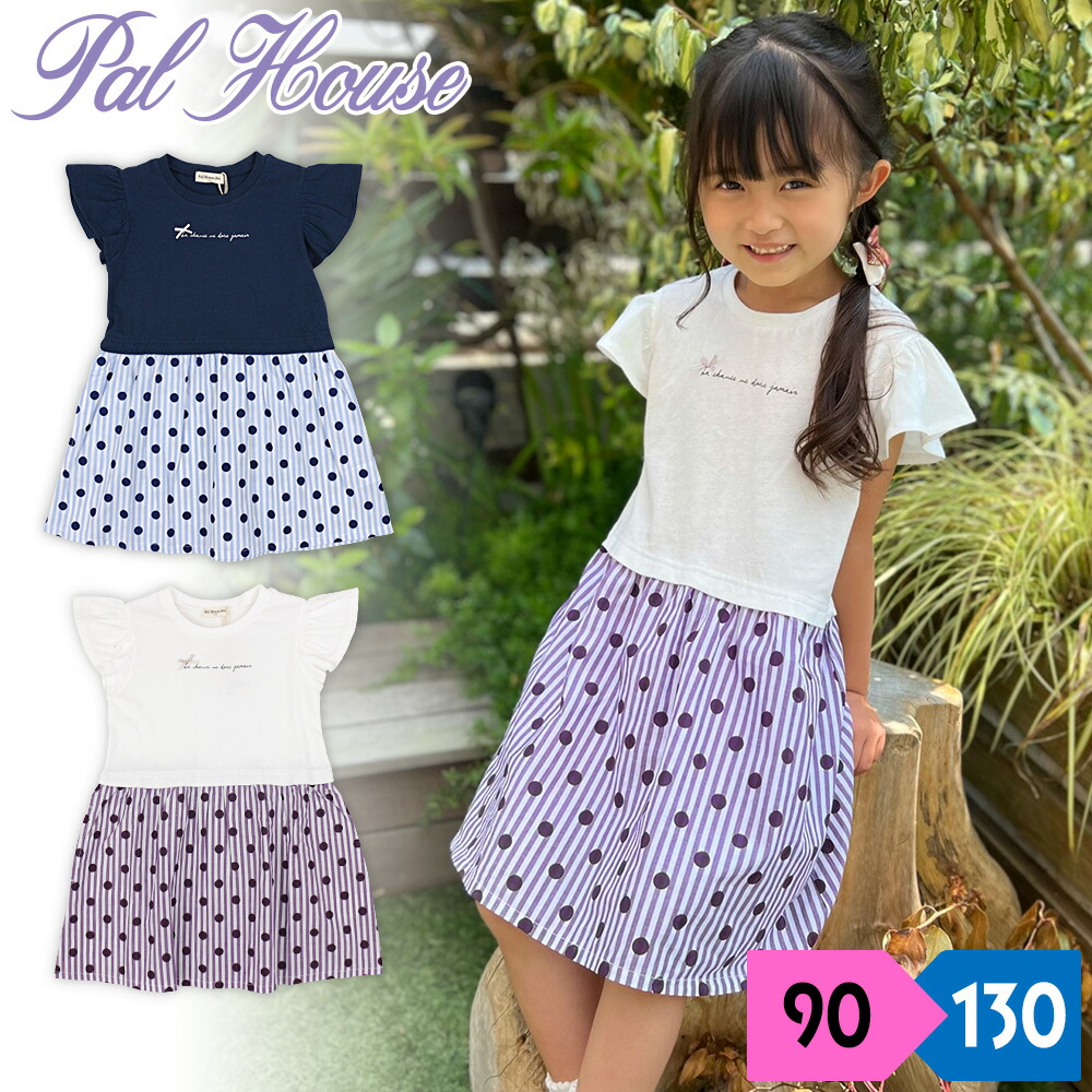 ワンピース 半袖 女の子 キッズ 子供 ドッキングタイプ フリル袖 ストライプ&ドット柄スカート シンプル かわいい ガーリー コットン 綿100% 夏 palhouse