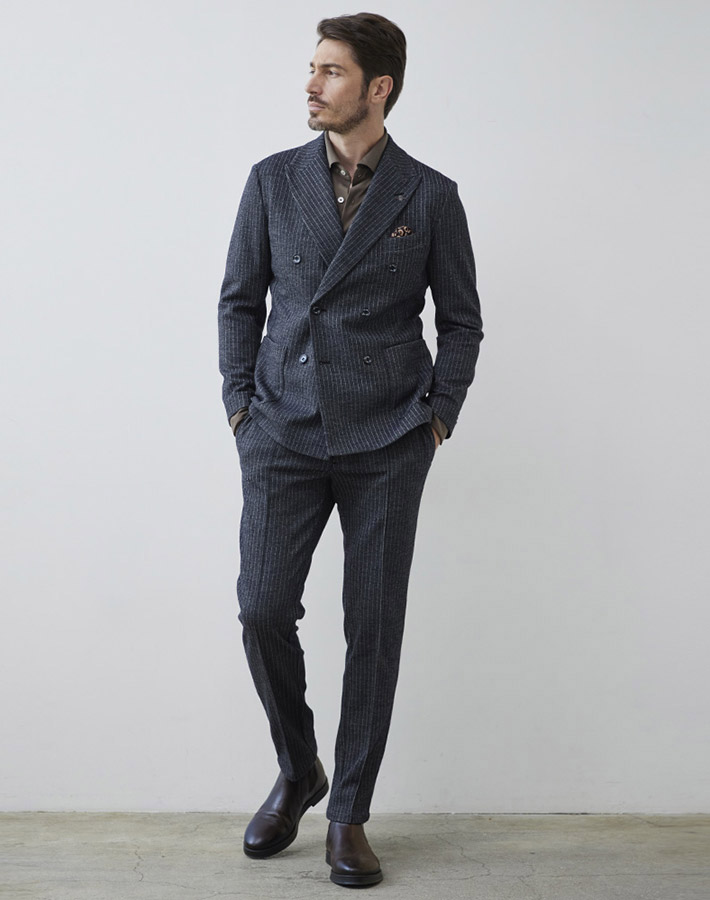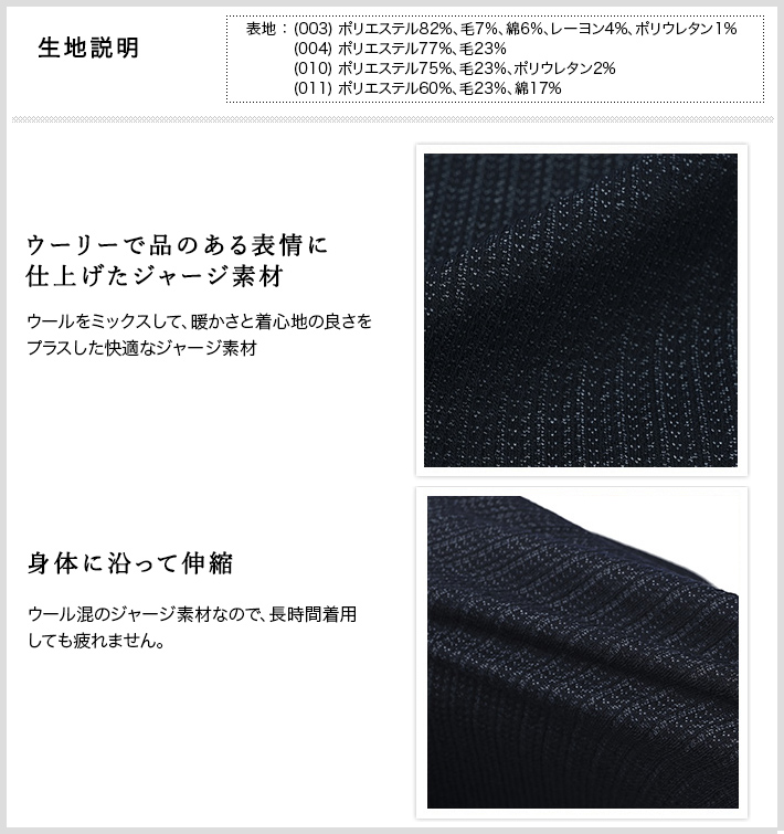 ほど良い肉厚感のウール混素材で、高級感と大人の品ある表情でありながら、体に沿って伸縮する快適な着心地を