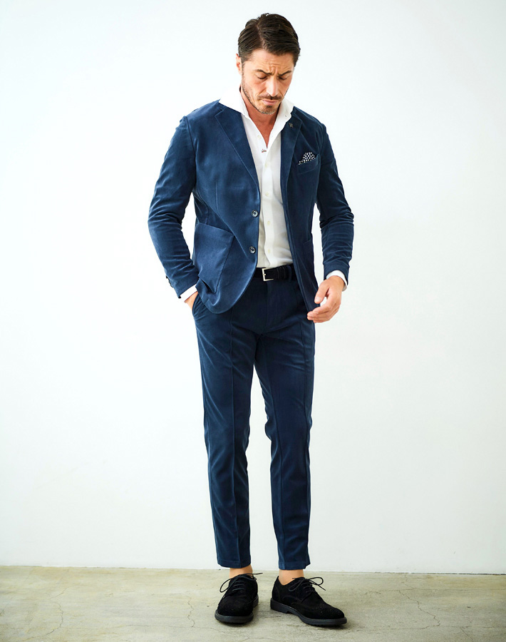 同素材のパンツ(品番:450513)を合わせてセットアップでドレッシーにこなすのも良し、ジーンズやチノパンなどを合わせたジャケパンスタイルでカジュアルに着流すのもお奨めです。