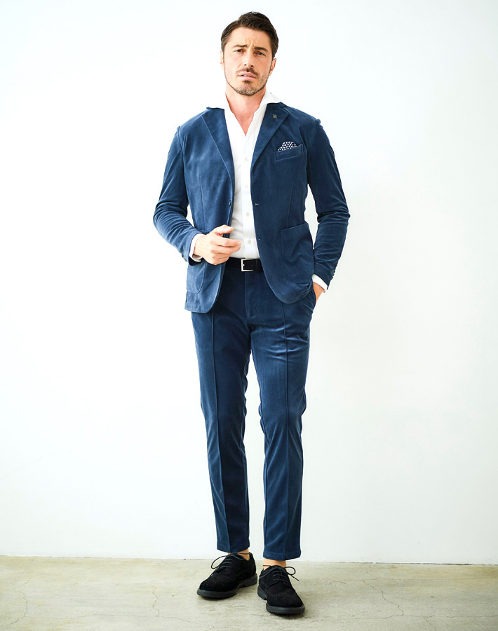 同素材のジャケット(品番:450213)を合わせてセットアップでドレッシーにこなすはもちろん、シックなカラ―なので、キレイ目なジャケパンスタイルにも活躍します。