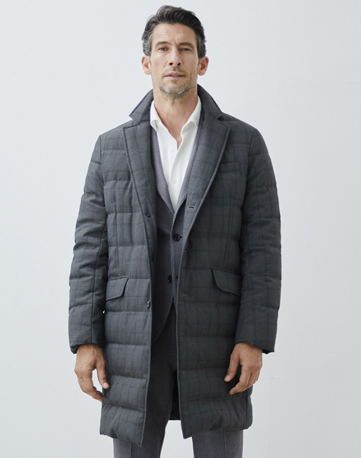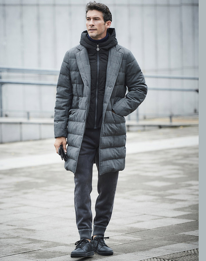 ウールルックなウインドウチェックがトラッドな面持ちのダウンコートは、ウールスラックスなどとも相性が良く、大人の冬のキレイ目スタイルに好適です。