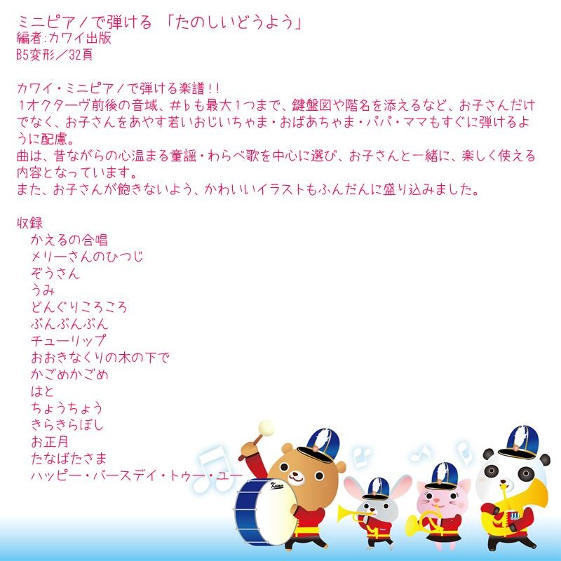 カワイ・ミニピアノで弾ける楽譜!!1オクターヴ前後の音域、#♭も最大1つまで、鍵盤図や階名を添えるなど、お子さんだけでなく、お子さんをあやす若いおじいちゃま・おばあちゃま・パパ・ママもすぐに弾けるように配慮。曲は、昔ながらの心温まる童謡・わらべ歌を中心に選び、お子さんと一緒に、楽しく使える内容となっています。また、お子さんが飽きないよう、かわいいイラストもふんだんに盛り込みました。