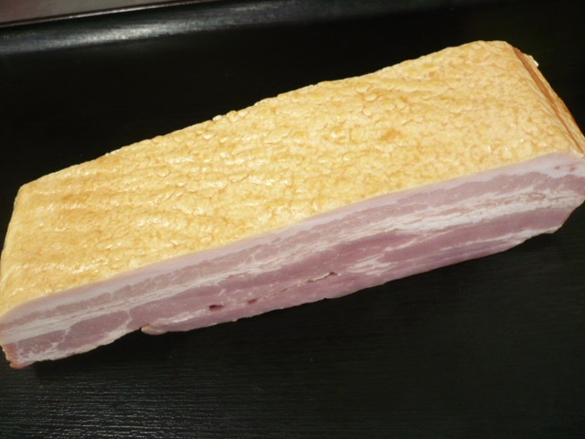 原材料:豚バラ肉、水あめ、食塩、大豆たん白、糖類(乳糖、砂糖)卵たん白、乳たん白、ポークブイヨン、酵母エキス、香辛料、リン酸塩(Na)、増粘多糖類、調味料(アミノ酸)・酸化防止剤(ビタミンC)、発色剤(亜硝酸Na)、コチニール色素 内容量 500g