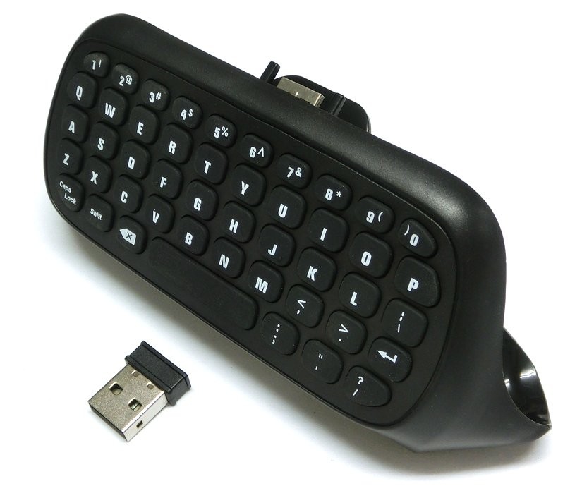 XBOXoneの純正コントローラーに取り付けて使用するミニキーボードです。XBOXone本体に付属のレシーバーを接続して使用します。電源はコントローラーより供給されます。