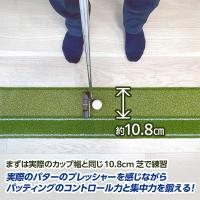 ホールカップに対して左側の芝は、実際のカップ幅と同じ10.8cm、カップサイズは少し小さい直径8cmとなっています。この幅で練習することで、実際のパターのプレッシャーを感じながら、パッティングのコントロール力と集中力を鍛えることができます。リターン機能により、カップに入ったボールは戻ってくるので繰り返し練習が可能です。