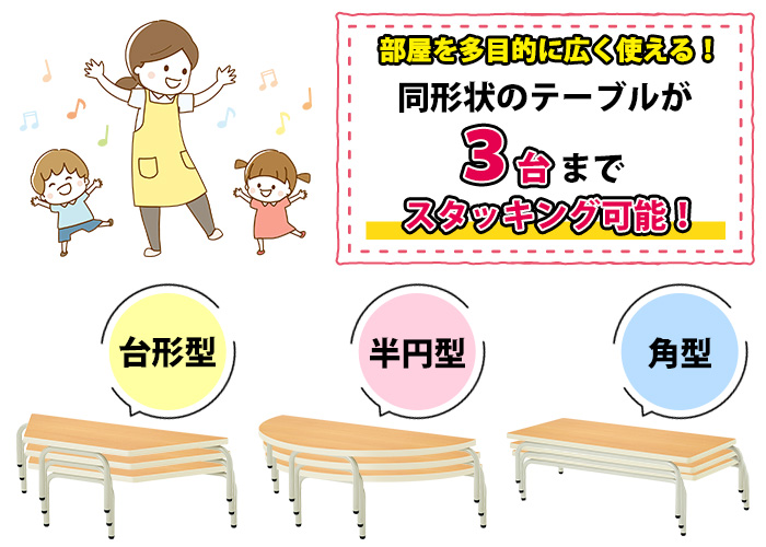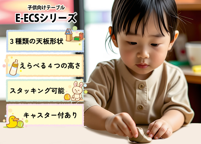 | 複数台を組み合わて柔軟にレイアウト 角型、台形型、半円型、3種類の天板形状と、330・580・640・700mmの4タイプの高さ展開で、さまざまなニーズに対応。 同形状のテーブルであれば、最大3台までスタッキングができ、限られたスペースを有効に活用できます。 教育施設や保育施設向けに設計された子供用テーブル E-ECSシリーズです。 |