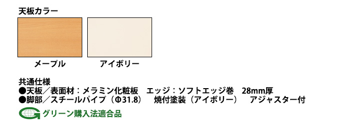 | 仕様 | ●天板/表面材:メラミン化粧板 エッジ:ソフトエッジ巻 28mm厚 ●脚部/スチールパイプ(Φ31.8) 焼付塗装(アイボリー) アジャスター付 キャスター:Φ40ナイロンキャスター ストッパー付 ●グリーン購入適合品 |